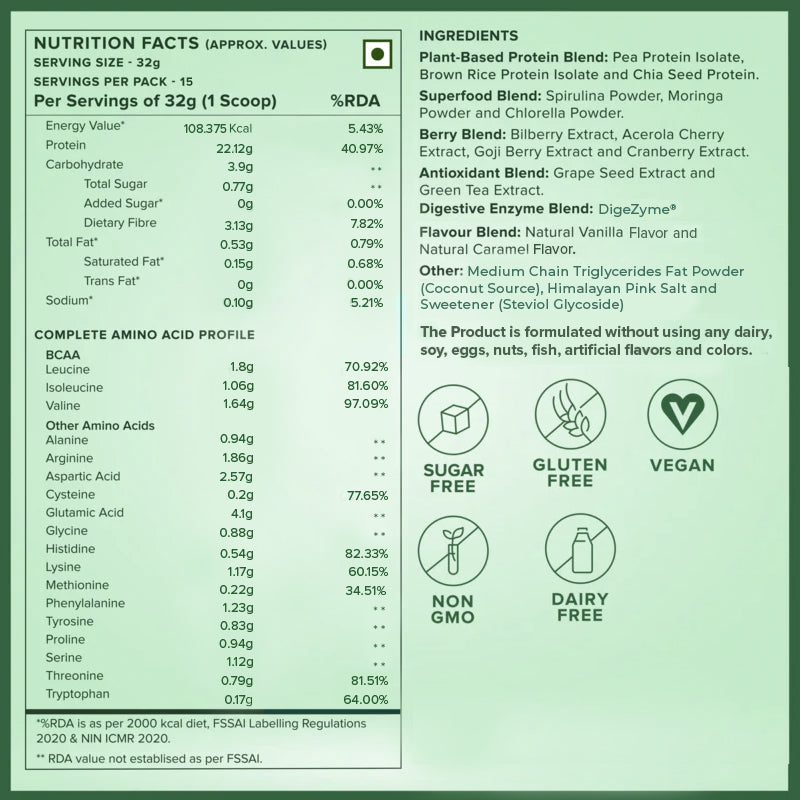 - 22g of protein per scoop from Golden European Pea, Brown Rice, and Chia Seed Protein.