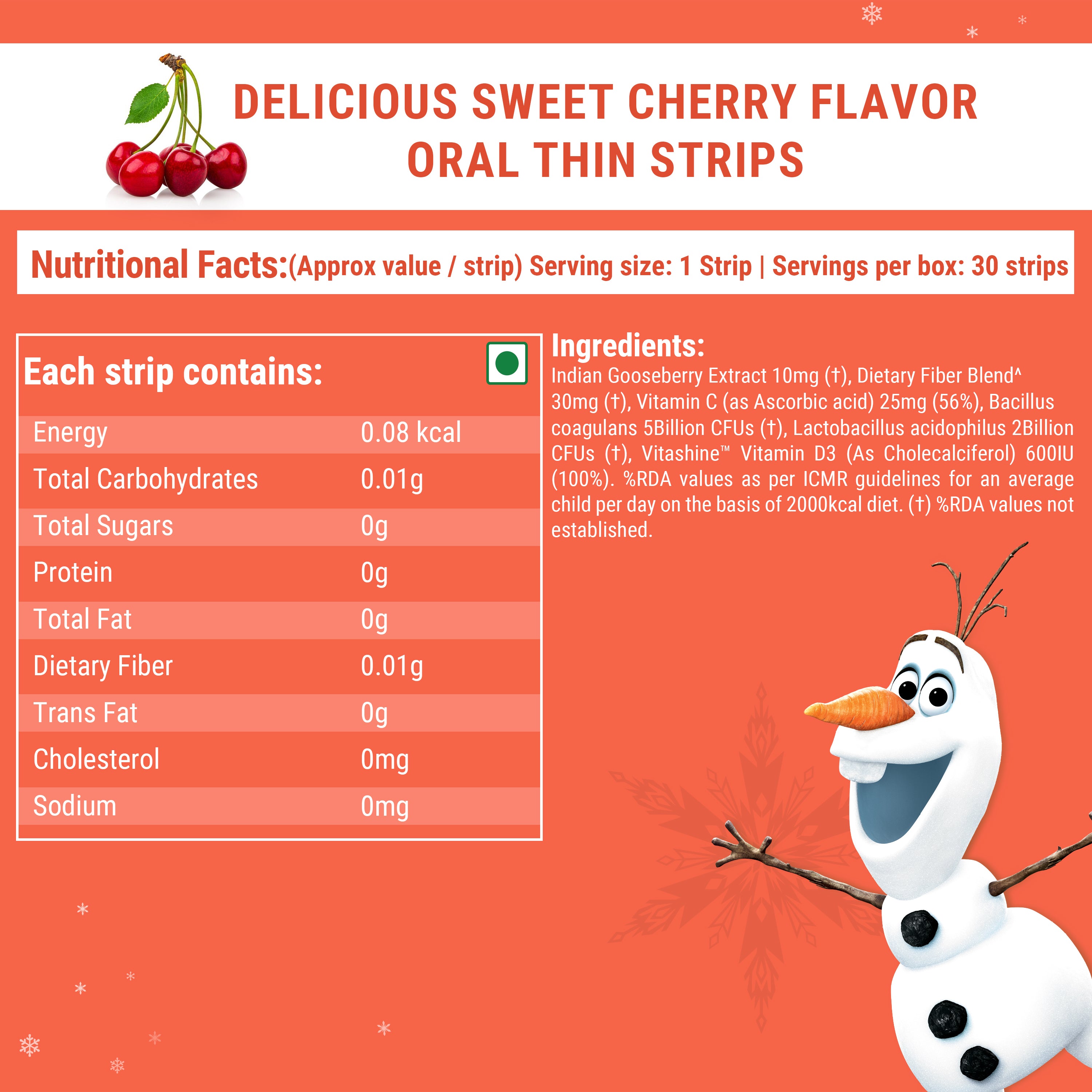 Wellbeing Nutrition's melts® Disney Frozen Probiotic oral strips combine natural ingredients for a healthy gut. They are formulated with a powerful blend of natural ingredients like Indian Gooseberry Extract, Dietary Fiber Blend, Vitamin C (as Ascorbic acid), Bacillus coagulans, Lactobacillus acidophilus, and Vitashine™ Vitamin D3 (As Cholecalciferol) to help boost immunity, improve gut health, and support digestion.