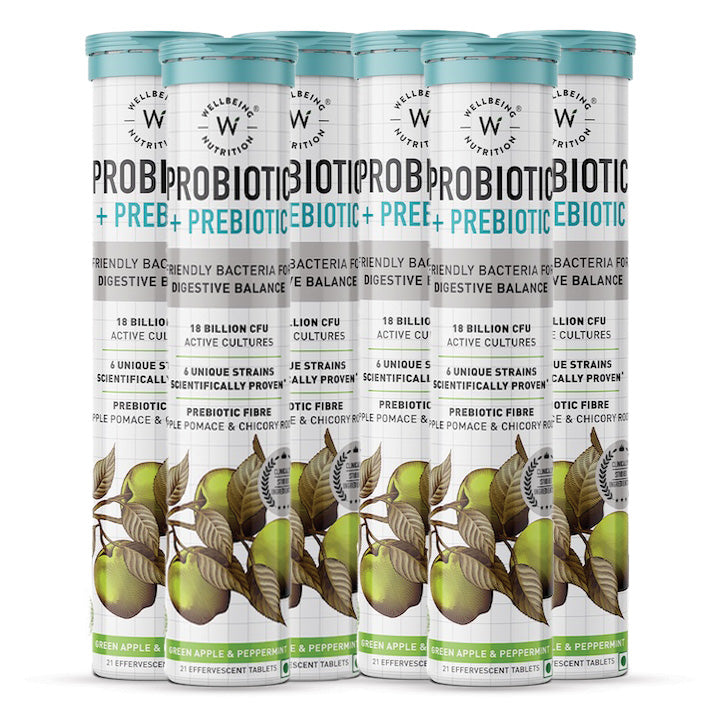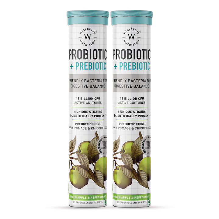 Probiotic + Prebiotic Tabs by Wellbeing Nutrition are distinct from other prebiotic & probiotic capsules, tablets, and powders available on the market. It consists of 6 unique, scientifically proven strains. This adds to the natural diversity of your microbiome and promotes more good gut bacteria. This shelf-stable, multi-strain probiotic supplement contains Lactobacillus and Bifidobacterium spp, which are the predominant probiotics of the gastrointestinal tract. Each tab provides 18 billion CFU of probiotics to help re-establish the good bacteria in the gastrointestinal tract, suppress the growth of pathogens, enhance nutrient absorption, and help maintain the normal immune response. As compared to the usual probiotic drinks, this is free from empty calories and allergens like lactose, gluten, and sugar. In addition, it also contains prebiotic fiber derived from apple pomace and chicory root, which nourishes and supports the growth of probiotics.