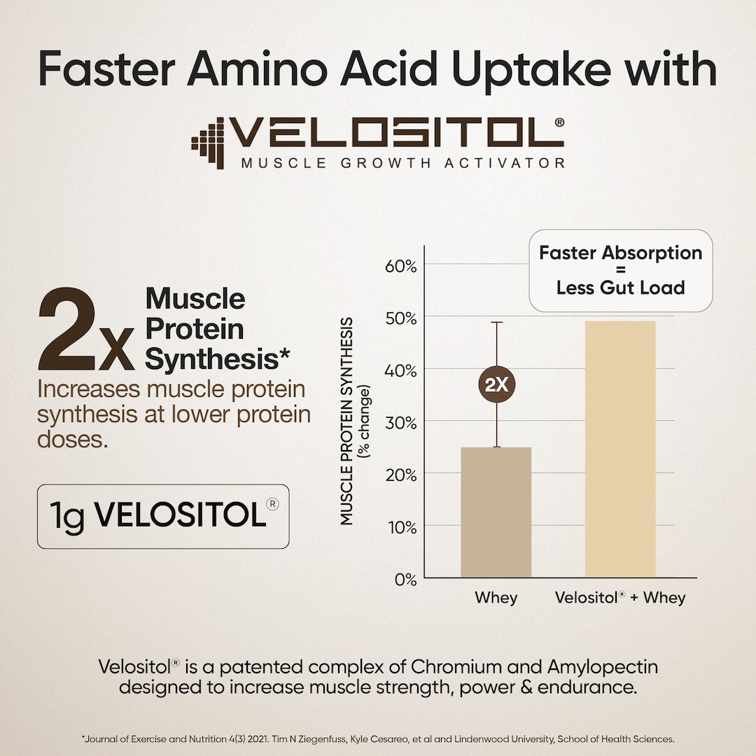 Each serving contains 1 g of Velositol®, a patented complex of amylopectin and chromium shown to enhance muscle protein synthesis by improving amino acid transport into muscle cells. Clinical data demonstrates greater improvements in strength, power and endurance when protein is paired with Velositol® compared to protein alone.