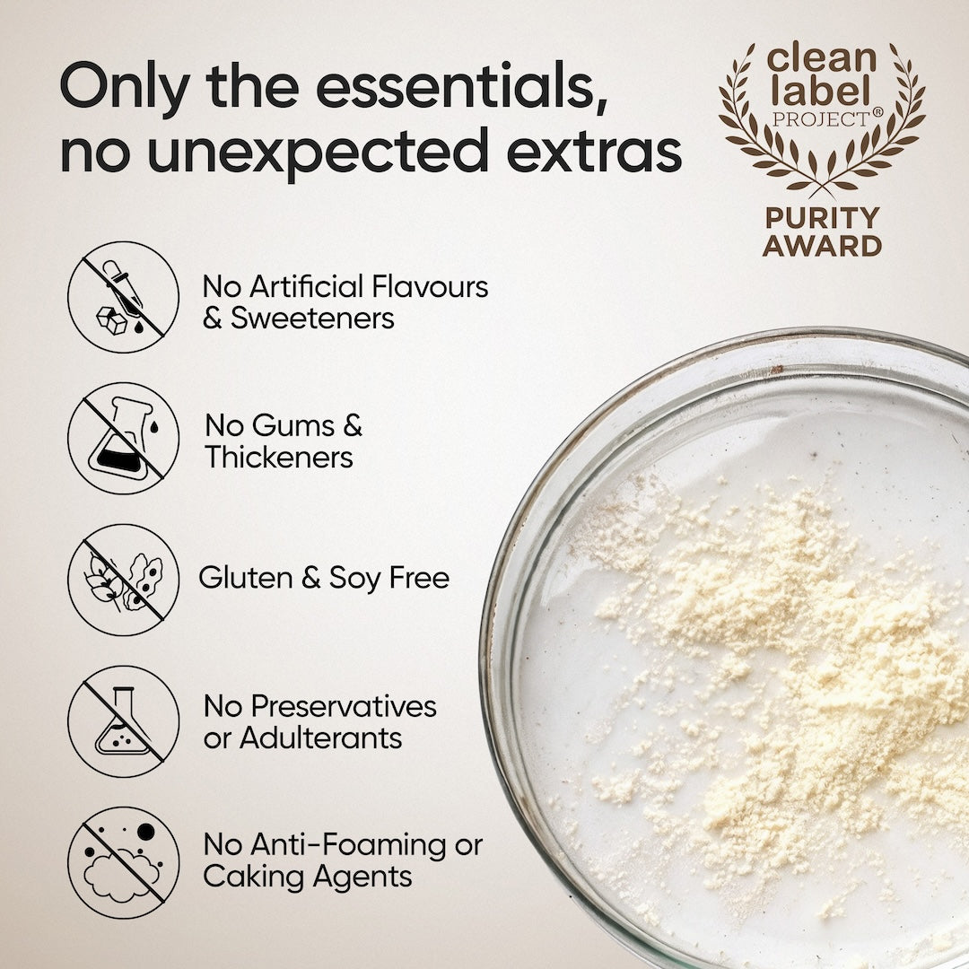 The protein is refined using low-temperature cross-flow microfiltration, a chemical-free process that separates protein from fat and lactose without compromising amino acid integrity.