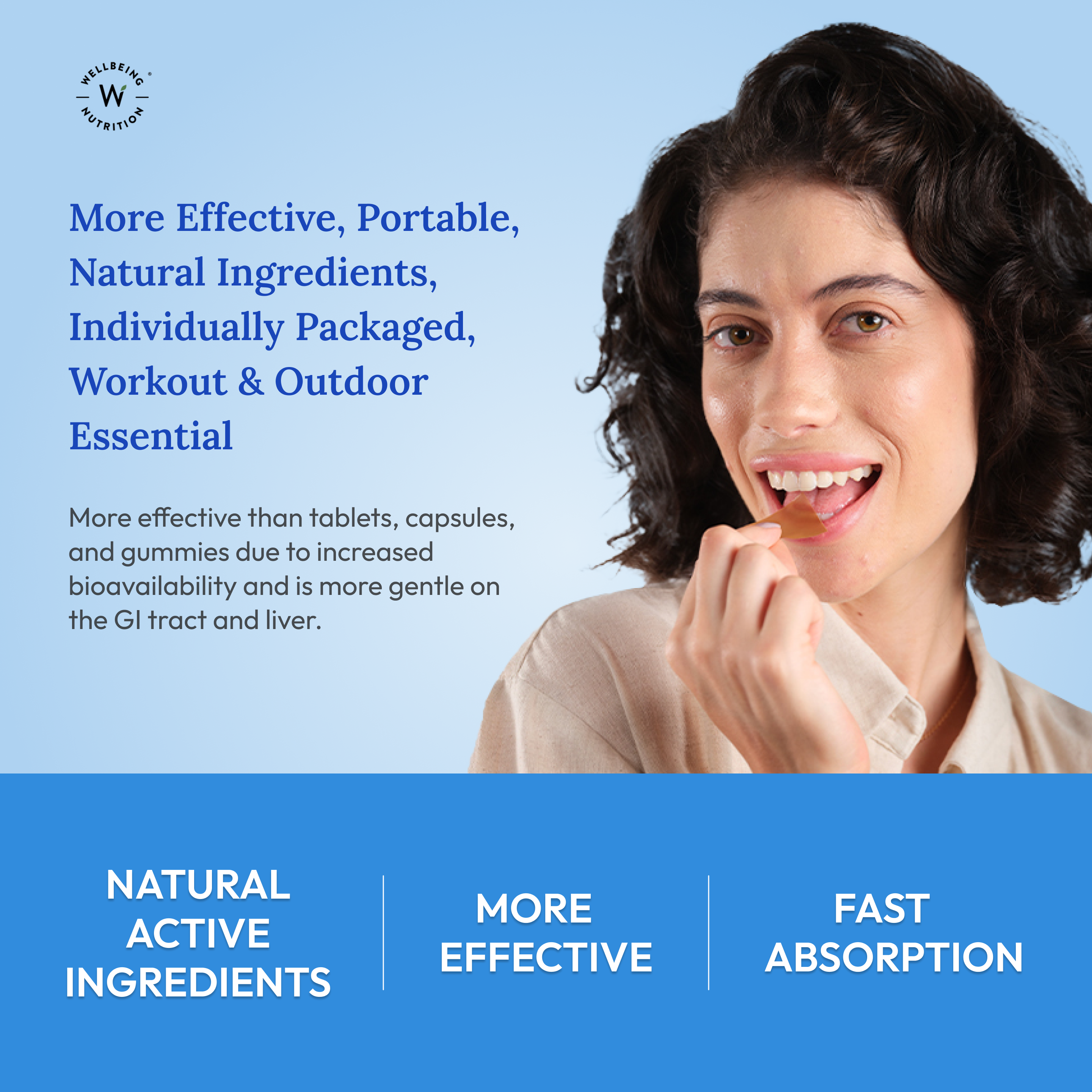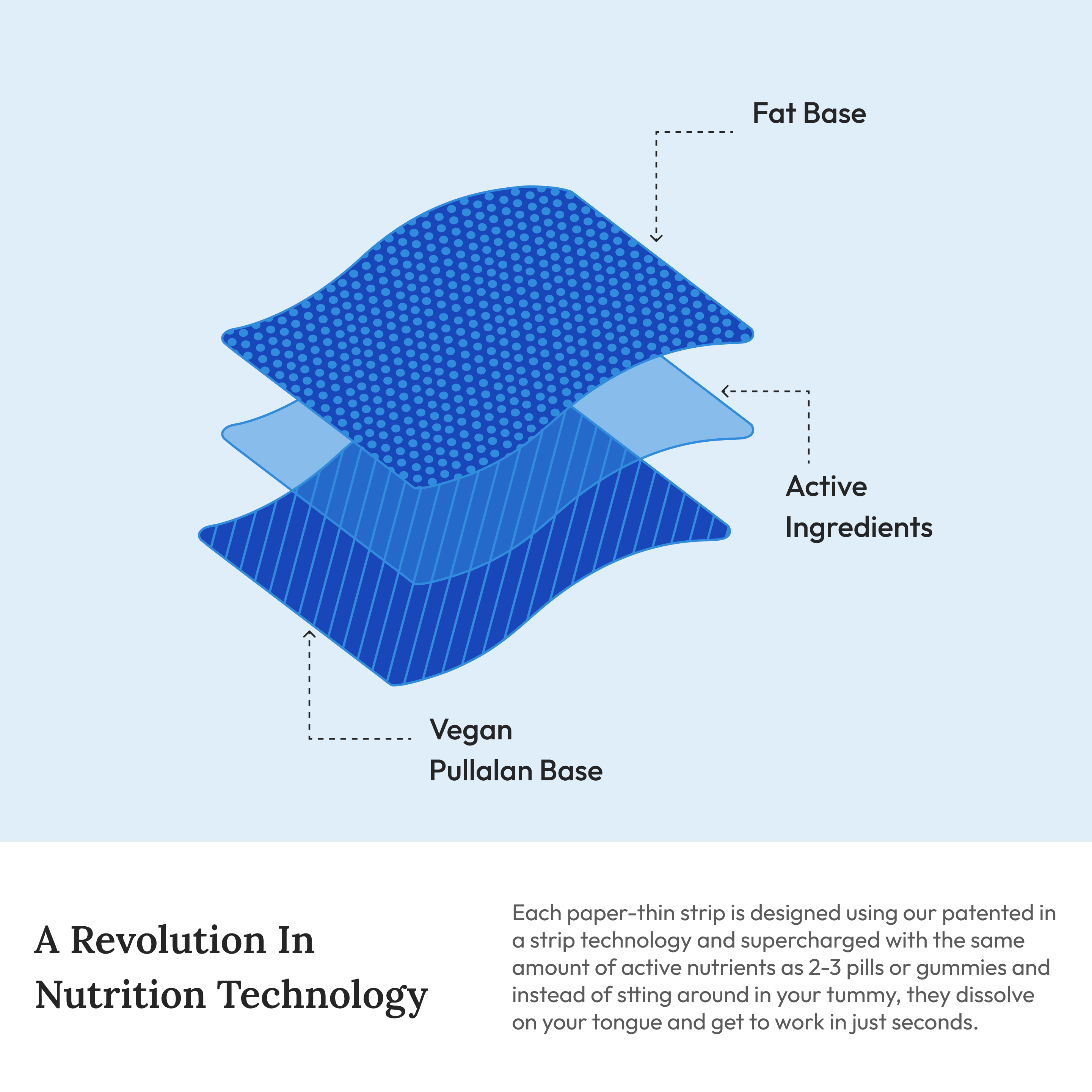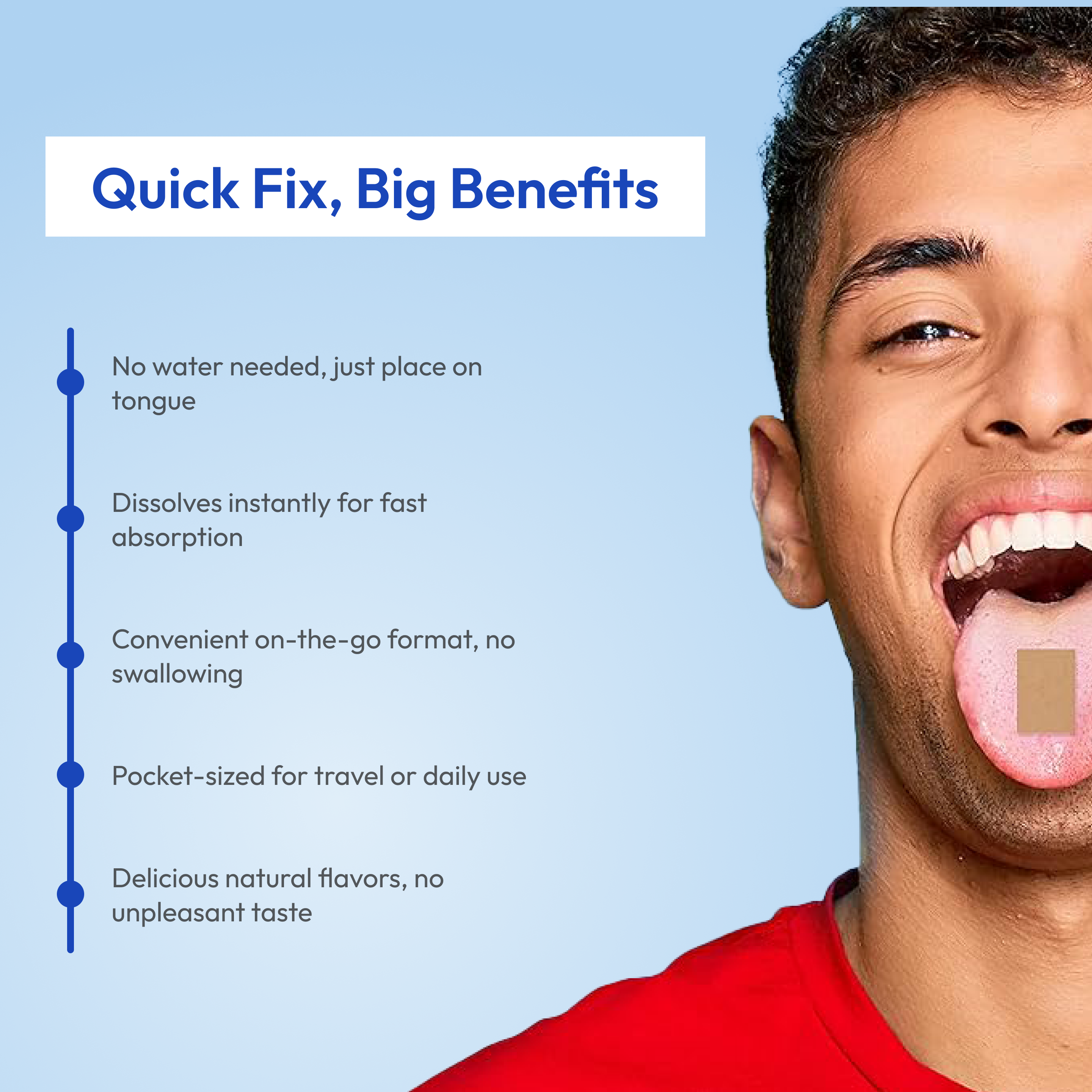 Our strips are made from 100% natural ingredients. ensuring a clean and efiective product. With micronized active ingredients for enhanced obsorption, these strips require no water and can be taken anywhere-no swalowing necessary.Enjoy 100% bioavailability for rapid nutrient delivery and instant benefits. Each strip offers a precise dose for consistent intake and optimal results.