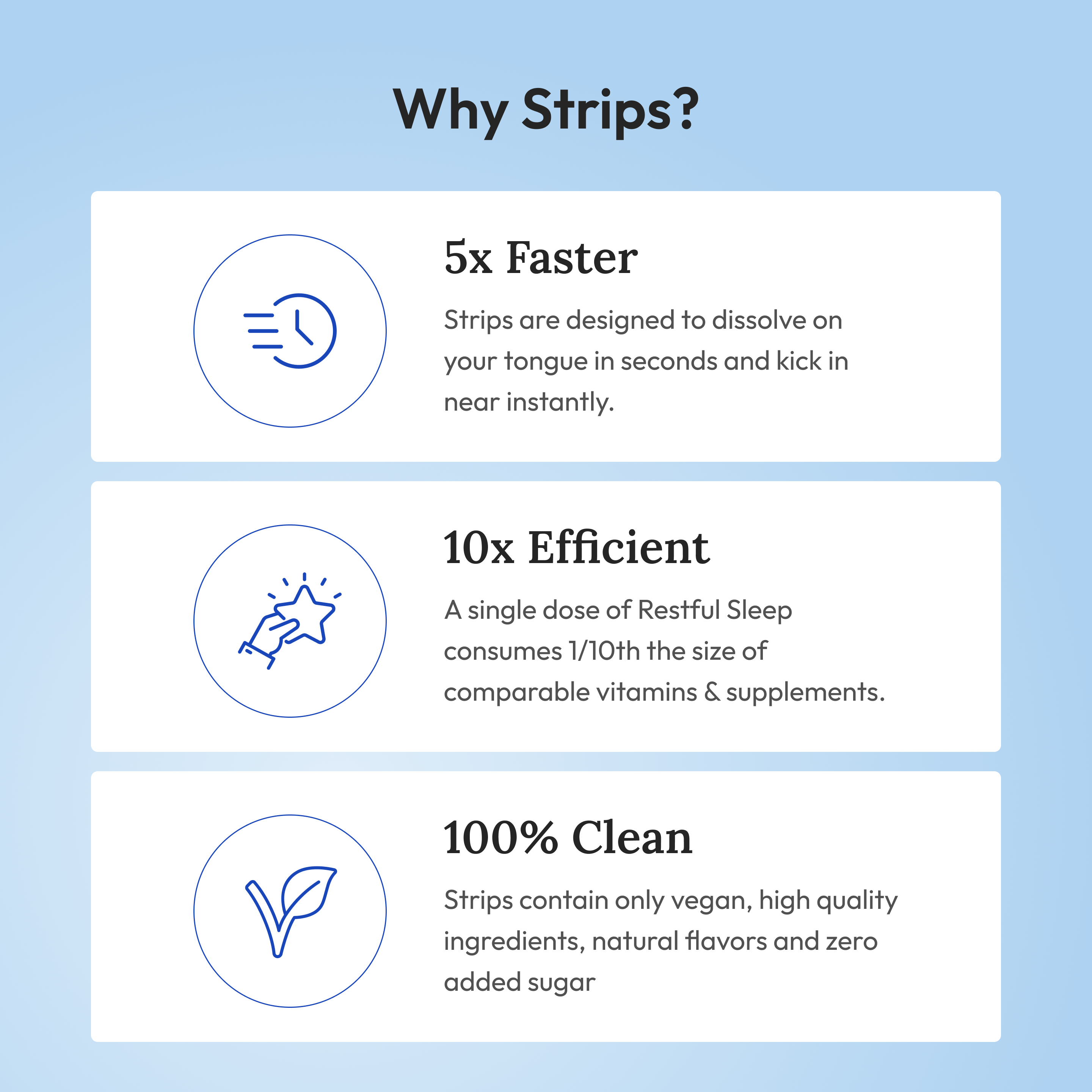 Unlike traditional sleep supplements, these oral strips dissolve on the tongue for rapid absorption—no water, no delay.