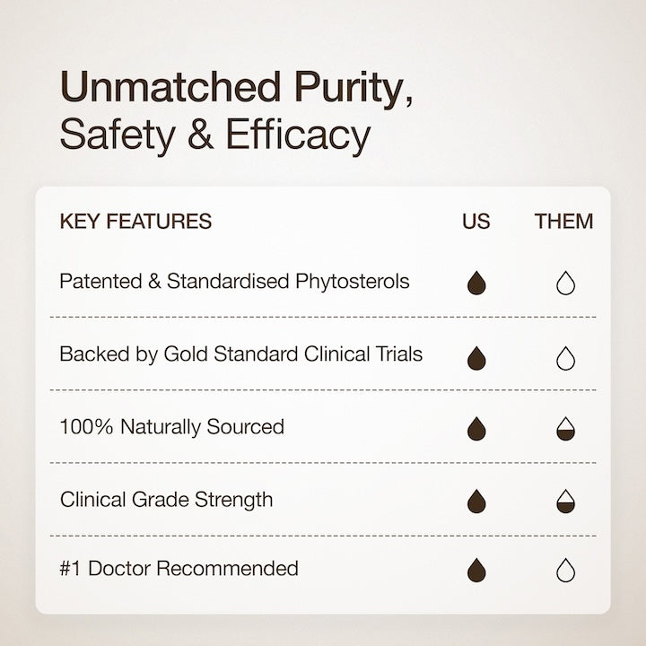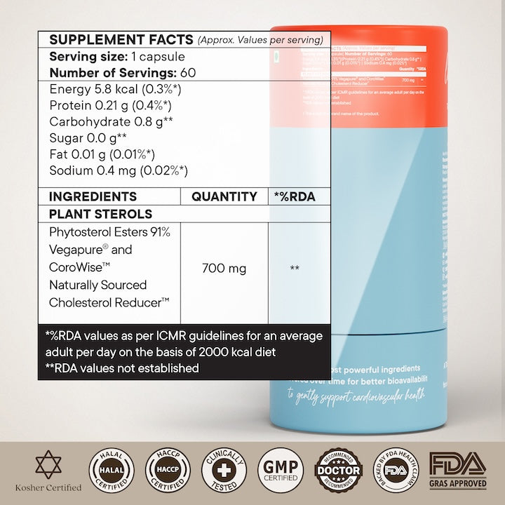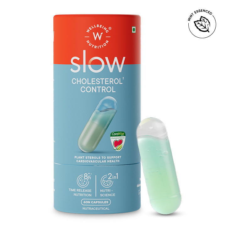SLOW Cholesterol Control is powered by a unique blend of clinically proven plant sterols CoroWise™ and Vegapure® known for their cholesterol-lowering benefits. CoroWise™, containing 6% free sterols as phytosterol esters is backed by 20+ clinical trials and supported by USFDA health claims. Studies have demonstrated its effectiveness, showing a 9% decrease in LDL cholesterol and a 7% reduction in total cholesterol within just 3 weeks, along with a 14% reduction in triglyceride levels over 6 weeks. Vegapure®, backed by 15+ clinical trials, is a highly concentrated plant sterol with 91% phytosterol esters, including, beta-sitosterol, campesterol and stigmasterol that supports heart health and healthy cholesterol management. Together, these scientifically backed ingredients make SLOW Cholesterol Control an effective solution for naturally improving lipid profiles.