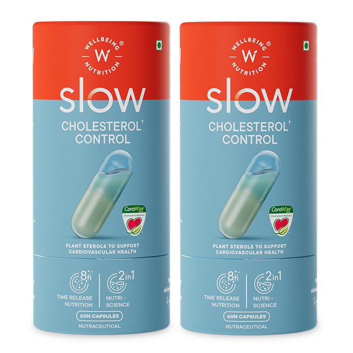 Our Slow Cholesterol Control features a unique blend of India’s first clinically proven and patented plant sterols CoroWise™ and Vegapure® that helps manage healthy cholesterol levels & support cardiovascular health. It controls the absorption of dietary cholesterol and prevents build up of bad (LDL) cholesterol providing a holistic approach to cholesterol management.