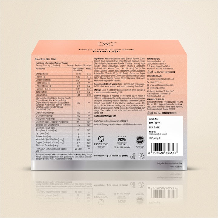2. Ingredient list: Orafti ® (Inulin),Glutathione, Macro-antioxidant blend: Powders - Lemon Powder (Citrus Limon), Black Pepper Extract (Piper nigrum), Beetroot Extract (Beta Vulgaris), Watermelon Powder (Citrullus Lanatus), Apple Powder (Malus Domestica), Hyaluronic Acid, Vitamin C (as L- Ascorbic Acid), Zinc (as Zinc Citrate), Vitamin E (as DL-alpha Tocopheryl Acetate), Lycopene, Astaxanthin, Vitamin B2 (as Riboflavin), Copper (as Cupric Citrate) , Biotin (as D-biotin), HOWARU ® (Bifidobacterium lactis) Bl-04® , Natural Orange Flavor, Steviol Glycoside, Citric Acid,Malic Acid, Magnesium Stearate