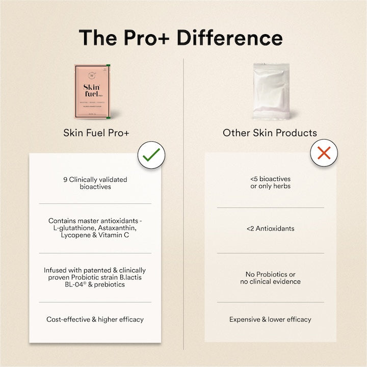 Skin Fuel Pro+ is an advanced multi-action skincare and gut health supplement designed to support the gut-skin axis. It contains L-Glutathione, Hyaluronic Acid, Astaxanthin, Vitamin C, Probiotic Bl-04®, and prebiotic fiber to repair cellular damage, restore moisture, and reduce pigmentation for healthier skin in 8 weeks.