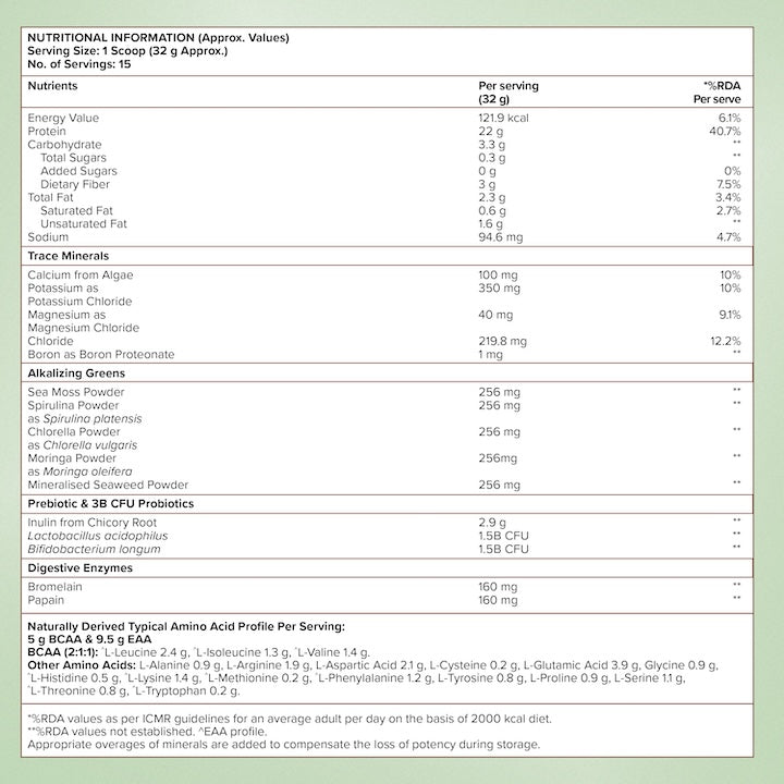 2. Ingredient list - Multi-Source Protein: Pea Protein Isolate, Whole Algal Protein, Quinoa Protein & Sprouted Amaranth Protein prebiotic Inulin from Chicory root, Probiotic Blend: Lactobacillus acidophilus and Bifidobacterium longum. Alkalizing Greens: Sea Moss Powder, Spirulina Powder, Chlorella Powder, Moringa Powder & Mineralised Seaweed Powder. Trace Minerals: Calcium, Potassium, Magnesium, Chloride & Boron, Coffee Powder, Digestive Enzymes: Bromelain & Papain Monk Fruit Alkalized Cocoa Powder MCT: Coconut Medium Chain Triglycerides Powder
