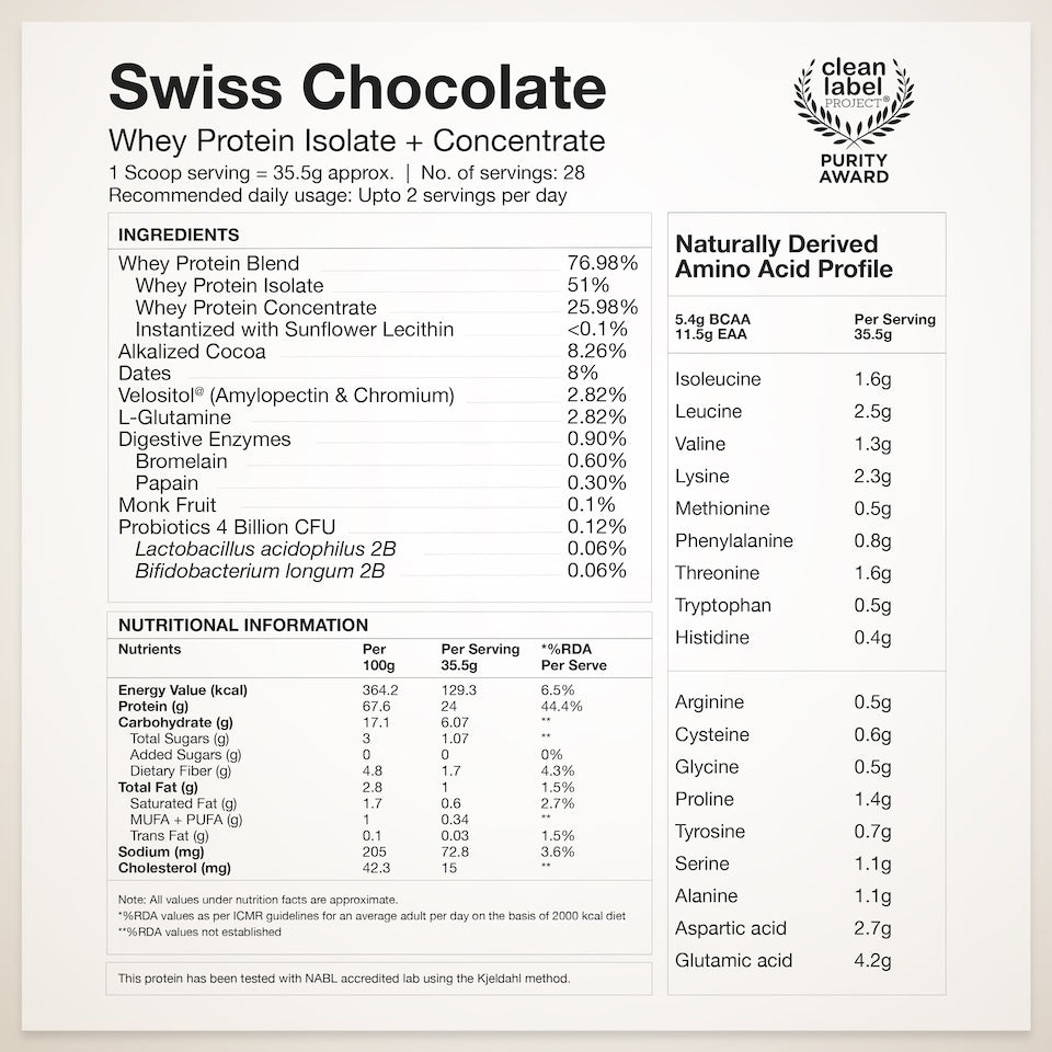 Introducing India’s first Whey protein isolate & concentrate powder with Velositol®, clinically proven to improve muscle strength & endurance in 8 weeks. Our ultra-pure, fast-absorbing Whey protein delivers 24 g protein, 11.5 g EAA, 5.4 g BCAA & 1 g Glutamine with 4 Billion CFU of probiotics & digestive enzymes for a gut-friendly dose of goodness without any bloating. Sweetened with zero-calorie monk fruit, our decadent Swiss chocolate-flavoured whey protein blend is instantized for a smooth, light texture, perfect for fueling workouts, recovery, and daily nutrition.