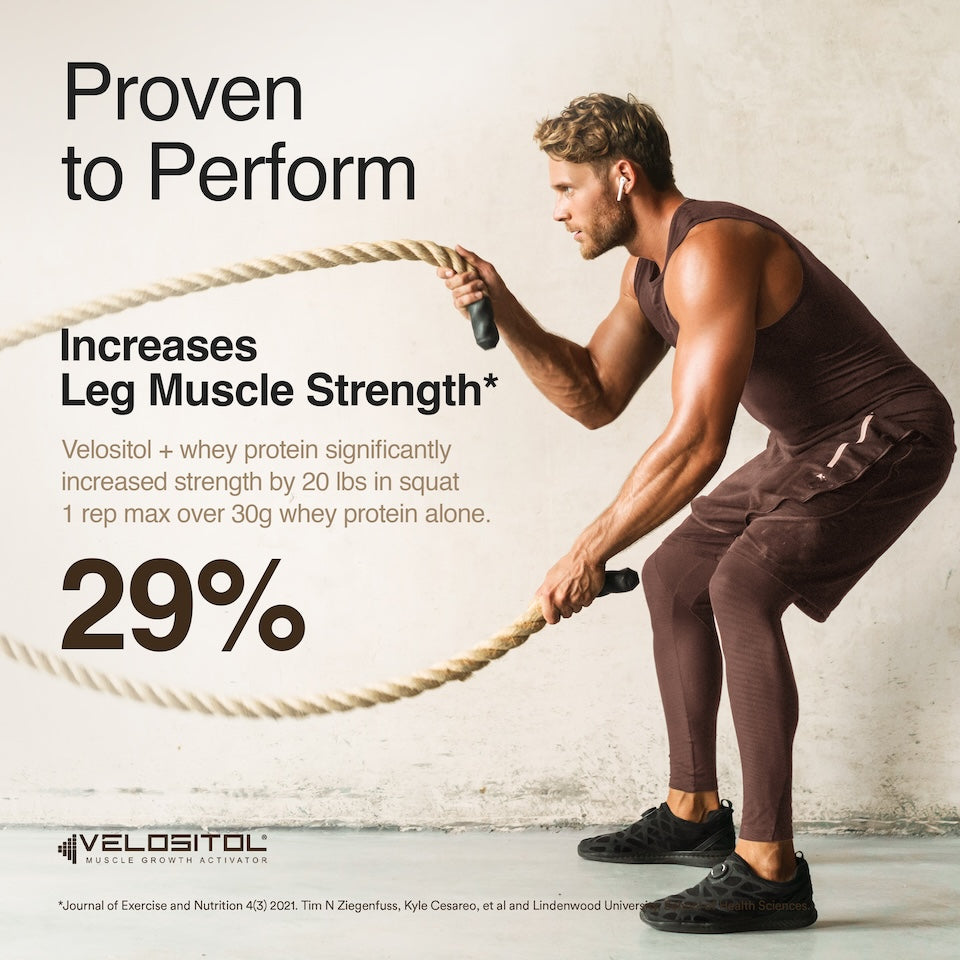Velositol® contains chromium, an essential trace mineral that's known to increase insulin sensitivity and insulinogenic function and therefore supports greater amino acid uptake into skeletal muscles. Preclinical and clinical studies show that subjects taking Velositol® had the highest myokine levels, muscle-derived peptides promoting MPS and hypertrophy.