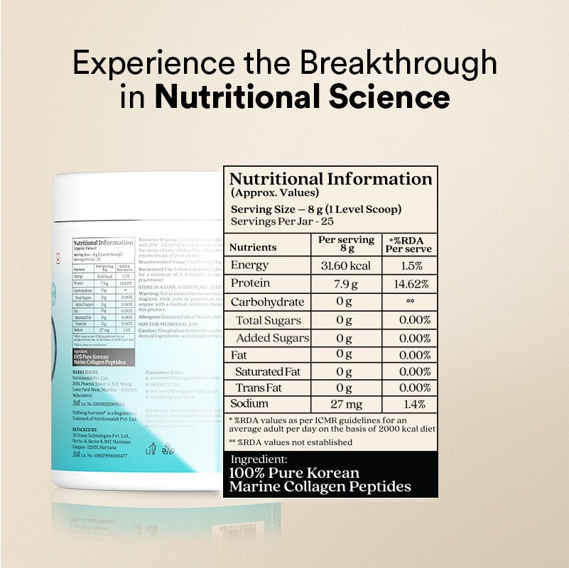 Introducing the World’s finest Hydrolyzed Type I & III Korean Marine Collagen Peptides, sustainably sourced from deep-sea Salmon. Backed by 20+ Clinical Studies, it visibly improves skin texture, elasticity, and hydration and diminishes wrinkles & fine lines. Made with flexibility in mind, our truly flavourless marine collagen powder seamlessly blends into any beverage, leaving your hair, skin, nails, joints, and gut glowing.