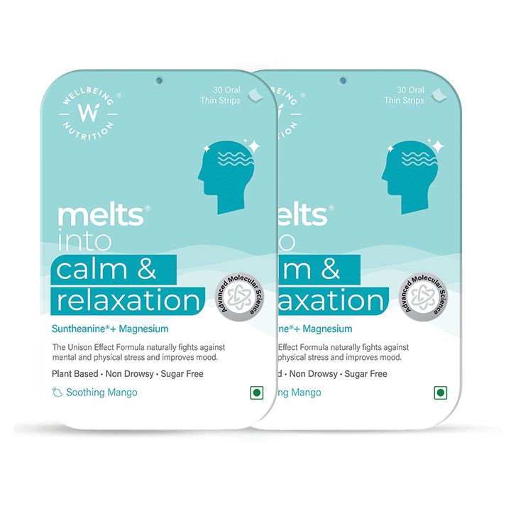 Our melts® Calm & Relaxation is India's first 100% natural, plant-based oral thin strip supplement designed to promote relaxation and relieve stress. It features Suntheanine®, a patented extract of L-theanine, along with Chamomile Extract, Ashwagandha Root Extract, and Pure Grade Saffron. This formula works by regulating cortisol levels and promoting a state of relaxation without drowsiness.