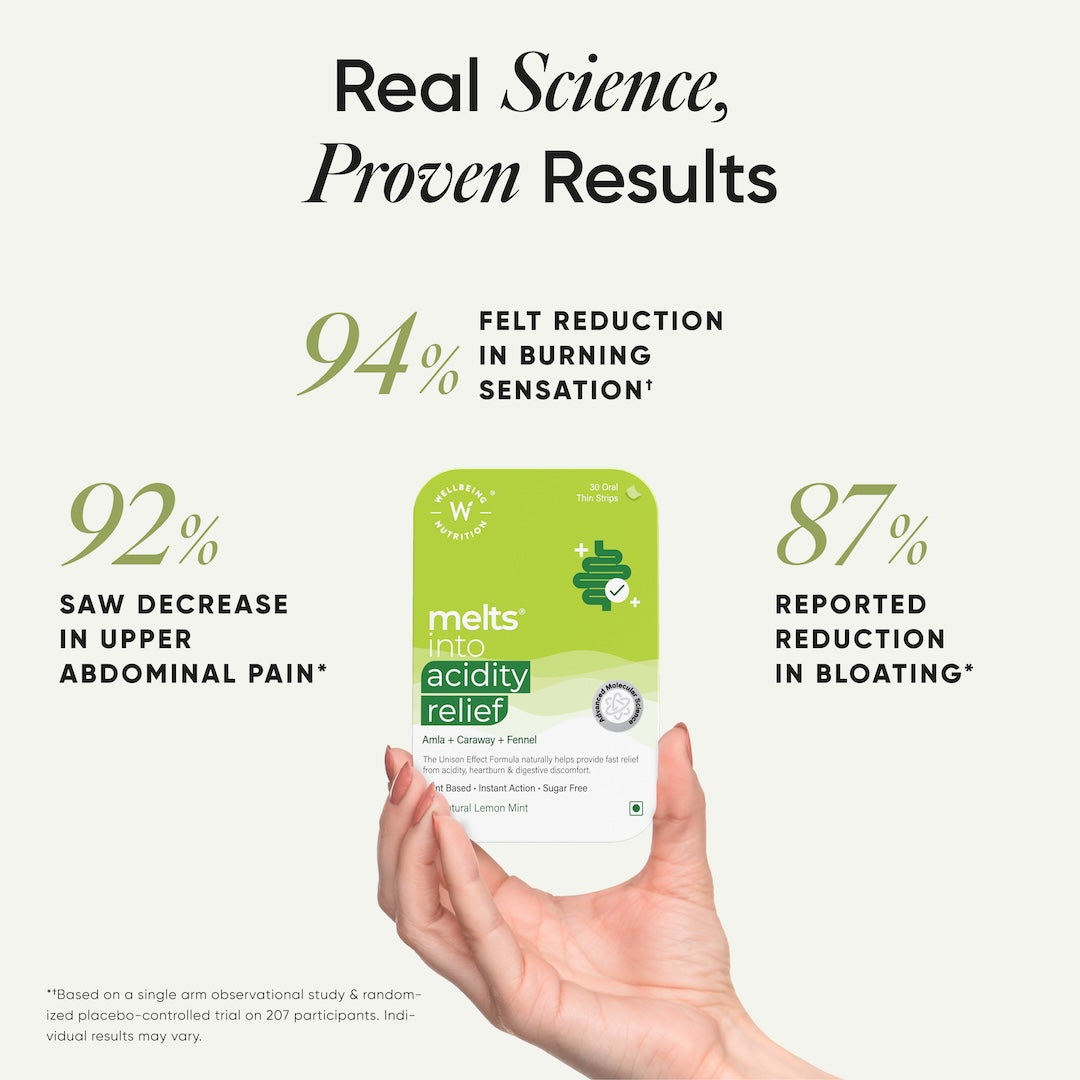 A fast-acting natural antacid that works in under 10 seconds, melts® Acidity Relief delivers 2x faster relief from acidity, heartburn, and indigestion. This natural, drug-free formula harnesses the power of time-tested botanical extracts like Amla, Caraway, Fennel, Mint, and Anise to neutralize excess stomach acid, restore pH balance, and soothe abdominal discomfort. Backed by 15+ clinical trials, it repairs the stomach lining and promotes better digestion for lasting relief.