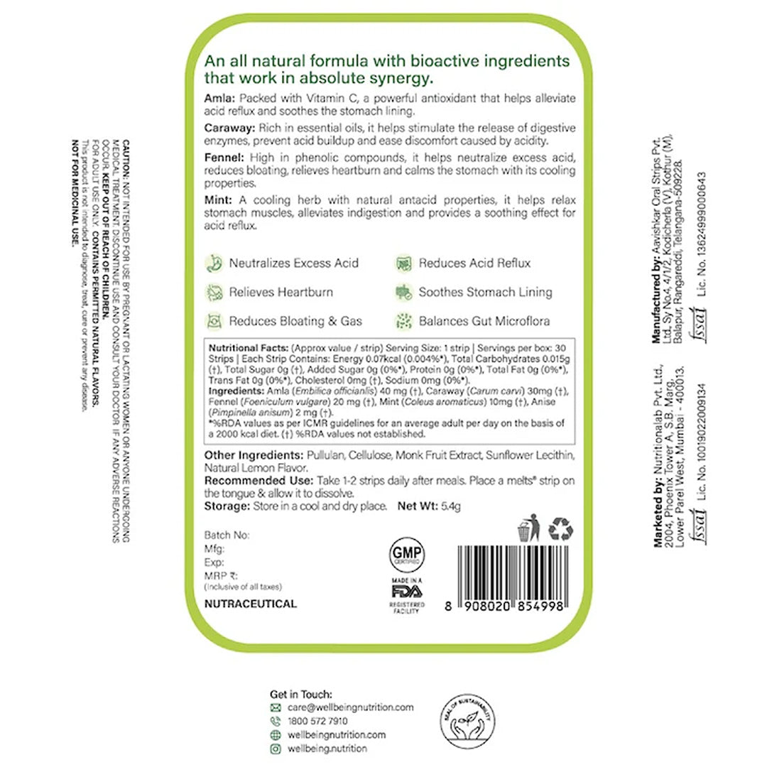 Melts® Acidity Relief is meticulously crafted with a potent blend of time-tested botanicals, each chosen for its unparalleled digestive benefits. Amla, rich in Vitamin C and powerful antioxidants, soothes the stomach lining while alleviating acid reflux at its root. Caraway, infused with essential oils, enhances digestive enzyme activity, prevents acid buildup, and relieves acidity-induced discomfort. Fennel, abundant in phenolic compounds, works to neutralize excess acid, ease bloating, and provide a naturally cooling effect for lasting relief. Mint, revered for its cooling and natural antacid properties, helps relax stomach muscles, alleviates indigestion, and soothes acid reflux with effortless ease. Together, these clinically backed ingredients work in harmony to deliver fast, effective, and long-lasting relief.