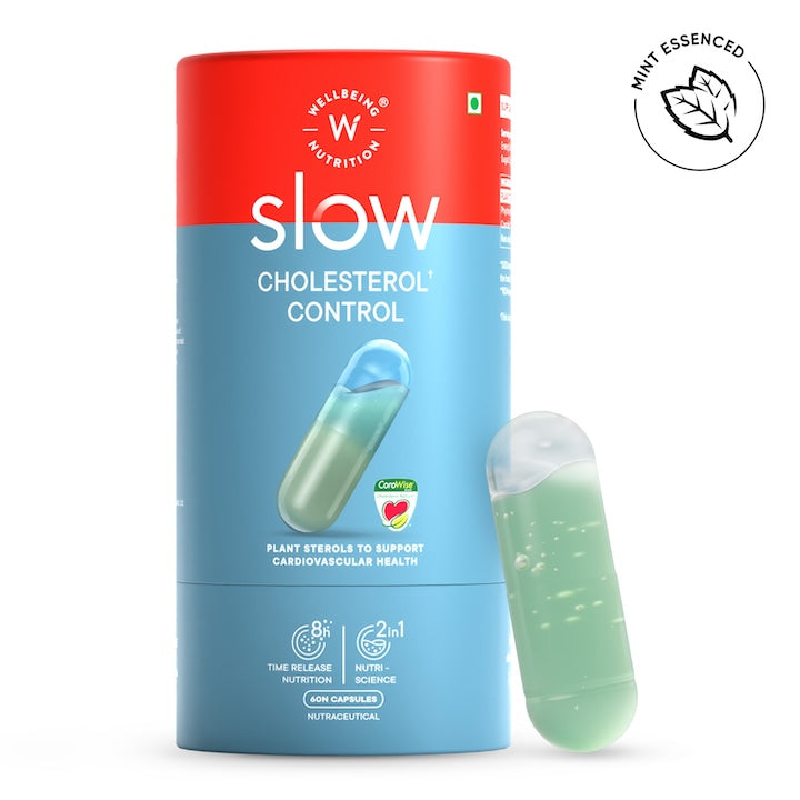 SLOW Cholesterol Control is powered by a unique blend of clinically proven plant sterols CoroWise™ and Vegapure® known for their cholesterol-lowering benefits. CoroWise™, containing 6% free sterols as phytosterol esters is backed by 20+ clinical trials and supported by USFDA health claims. Studies have demonstrated its effectiveness, showing a 9% decrease in LDL cholesterol and a 7% reduction in total cholesterol within just 3 weeks, along with a 14% reduction in triglyceride levels over 6 weeks. Vegapure®, backed by 15+ clinical trials, is a highly concentrated plant sterol with 91% phytosterol esters, including, beta-sitosterol, campesterol and stigmasterol that supports heart health and healthy cholesterol management. Together, these scientifically backed ingredients make SLOW Cholesterol Control an effective solution for naturally improving lipid profiles.