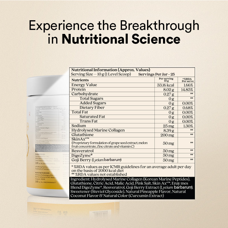 Introducing Wellbeing Nutrition's Glow Collagen, a dermatologist-recommended formula designed to transform your skin from within. With 8000 mg of Premium Wild Caught Pure Marine Collagen (Type I & III) sourced from deep-sea fish and 5x higher absorption, this potent blend is enriched with clinically validated ingredients like SkinAx²™ and Glutathione. Backed by over 10+ clinical studies, it supports skin health, elasticity, and a radiant complexion. Unlock the secret to glowing, youthful skin and elevate your beauty with this expertly crafted collagen powder.