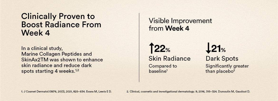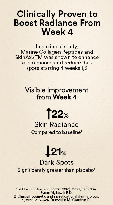 Our collagen peptides are sustainably sourced from wild-caught Korean salmon and are certified platinum-grade quality, third-party tested to ensure they are completely mercury-free. Nano-hydrolyzed to a molecular size of (< 1000 daltons) absorbs 5x times better, bypassing the digestive system for superior bioavailability and easier metabolization by the body. This powerful formula is combined with clinically studied ingredients such as SkinAx²™, Glutathione, Resveratrol, DigeZyme™, and Goji berry to enhance its effectiveness.