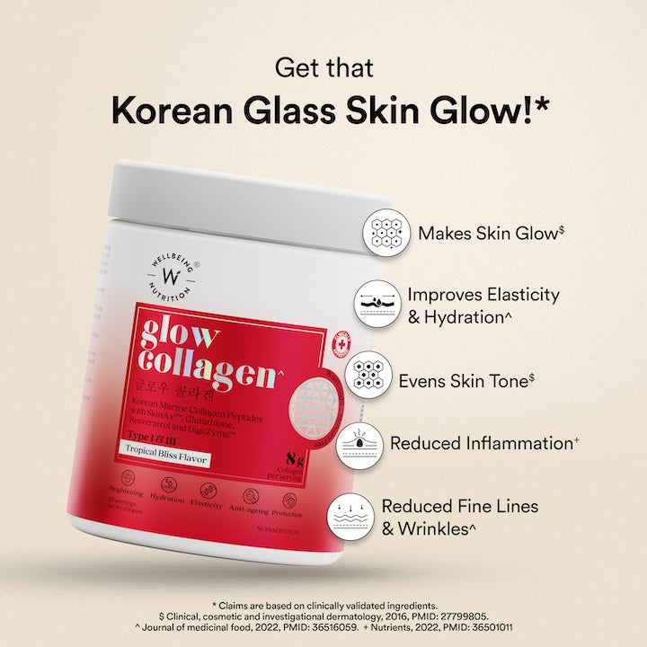 Introducing Wellbeing Nutrition's Glow Collagen, featuring 8000 mg of Premium Wild Caught Pure Marine Collagen (Type I & III) from deep-sea fish with 5x higher absorption, designed to transform your skin from within. Enriched with Liposomal Glutathione, a highly absorbable antioxidant that reduces pigmentation and oxidative stress while being protected from digestive breakdown for faster, more effective results. Combined with Vitamin C, a potent antioxidant that boosts collagen production, strengthens your skin’s natural defense against pollution and sun damage and further reduces oxidative stress. Backed by over 10 clinical studies, this dermatologist-recommended formula supports skin health, elasticity and a radiant, youthful complexion.