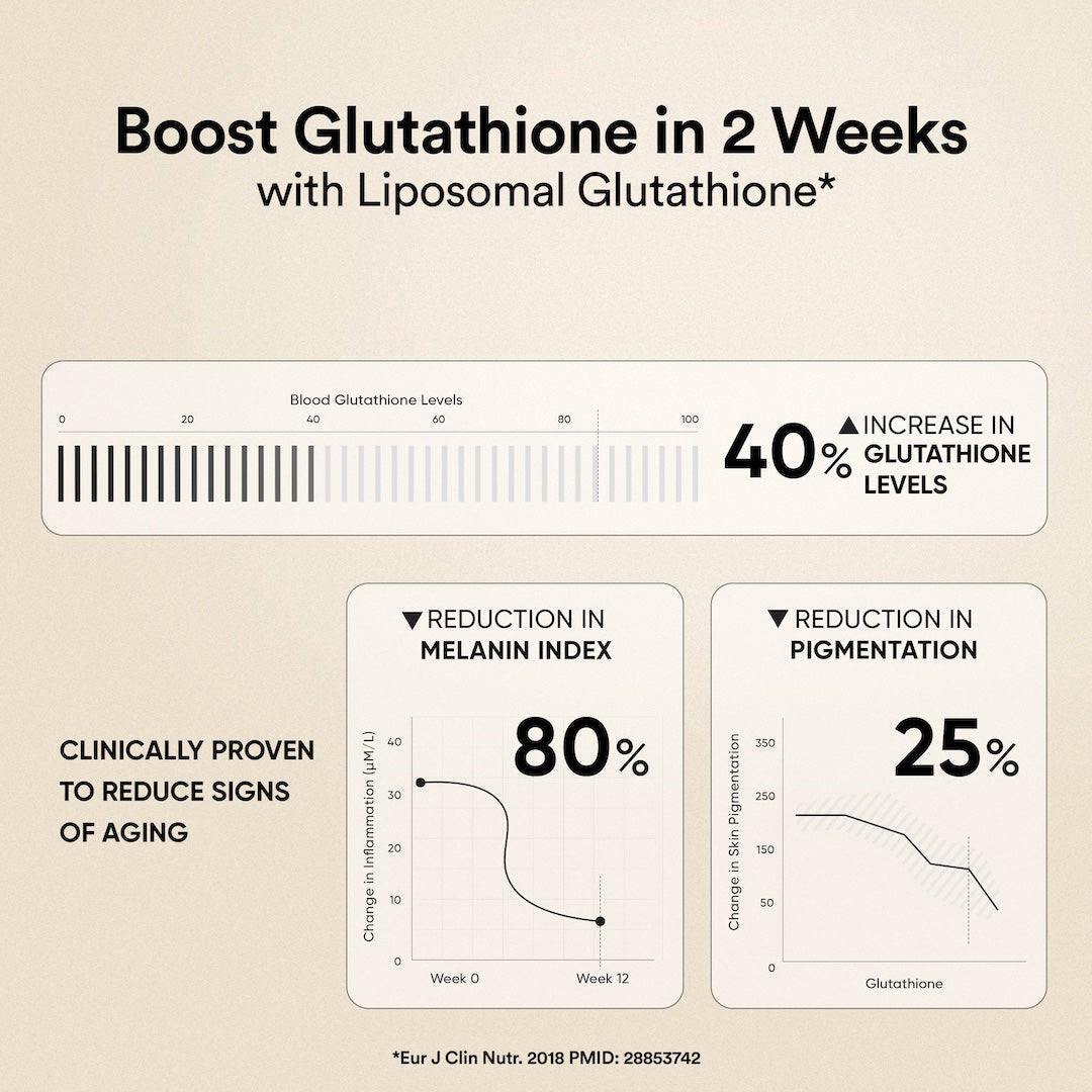 It’s a highly absorbable antioxidant protected by liposomal technology, which prevents breakdown in digestion, allowing it to work faster in reducing pigmentation, oxidative stress and uneven skin tone.