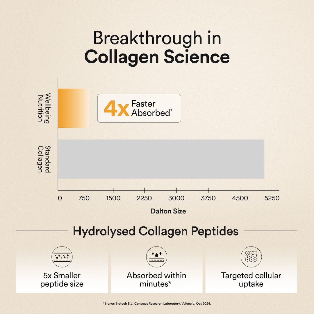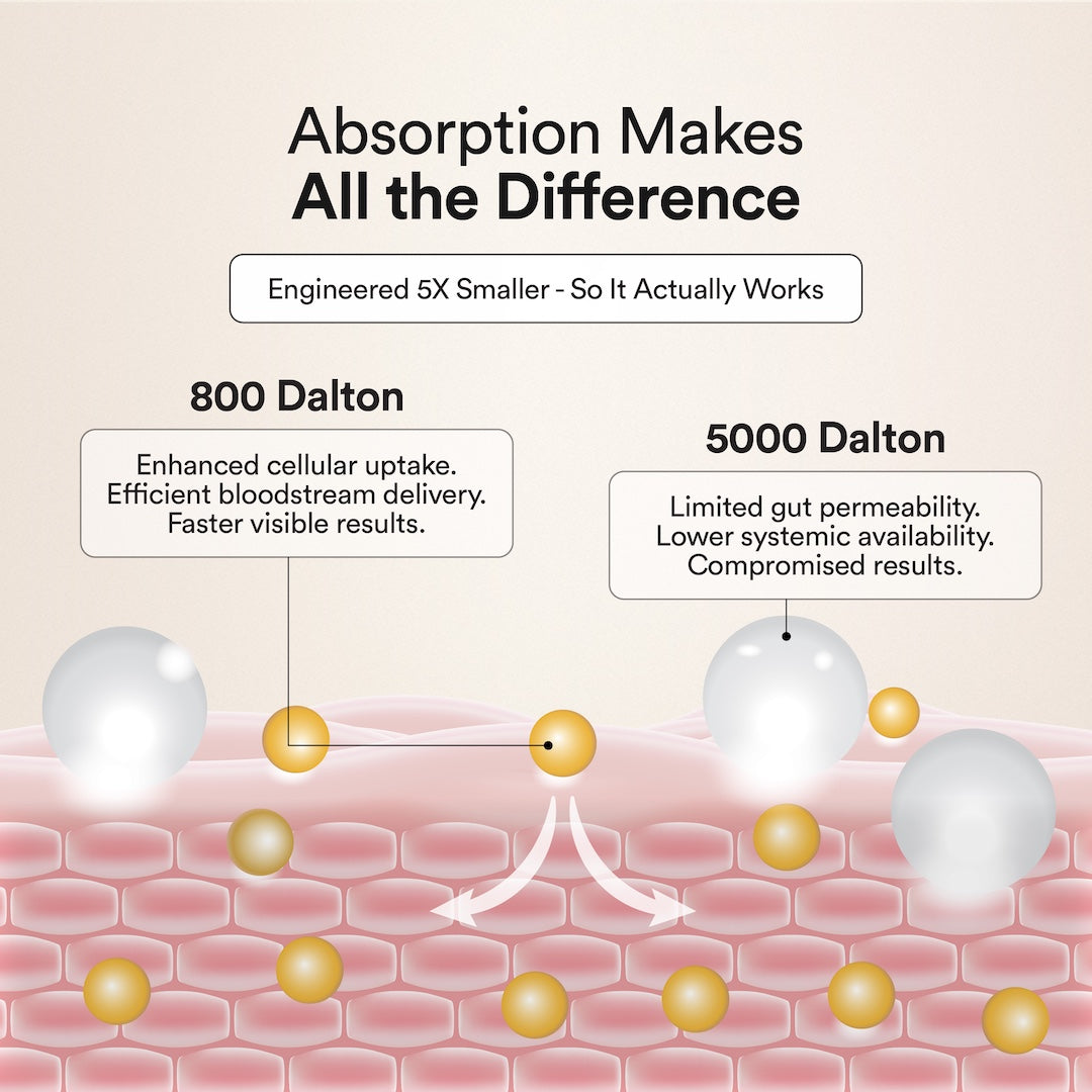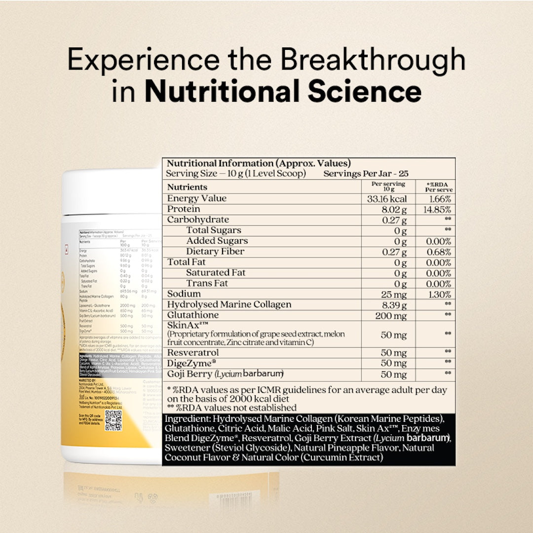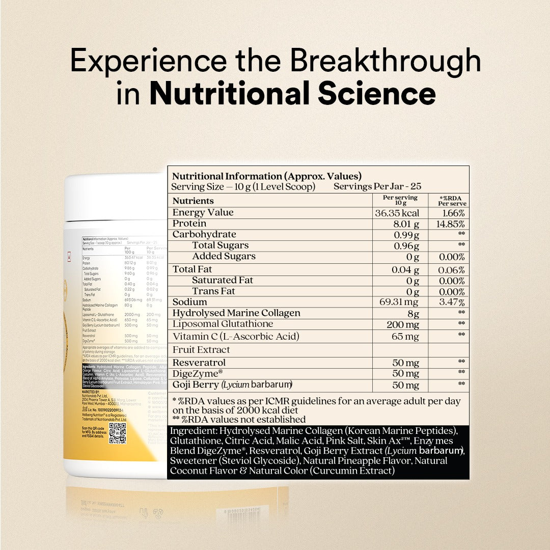 It contains nano-hydrolyzed marine collagen peptides with superior absorption, paired with clinically studied antioxidants and digestive enzymes for enhanced results.