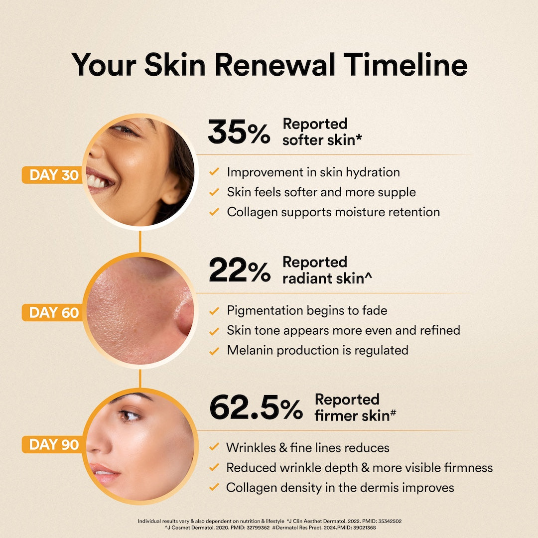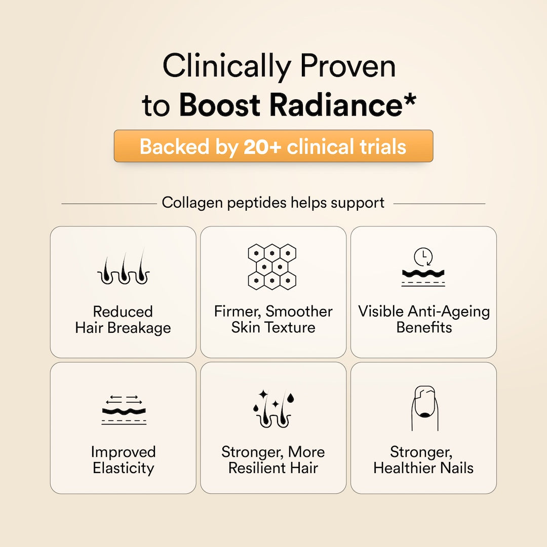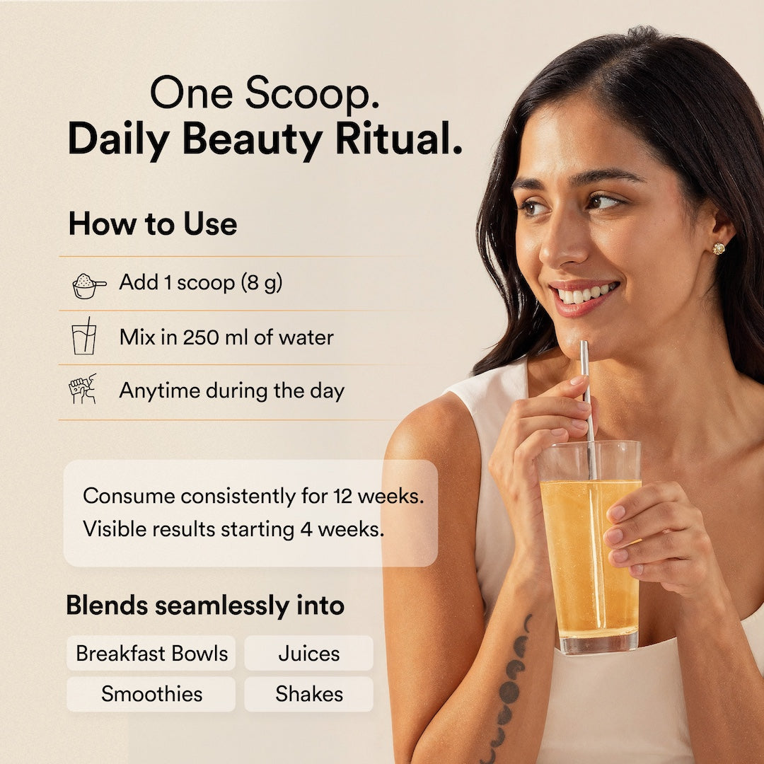 Glow Collagen blends 8000 mg of premium marine collagen with antioxidants like Liposomal Glutathione, Vitamin C, Resveratrol and Goji Berry, making it a powerhouse for brighter, firmer and youthful-looking skin.