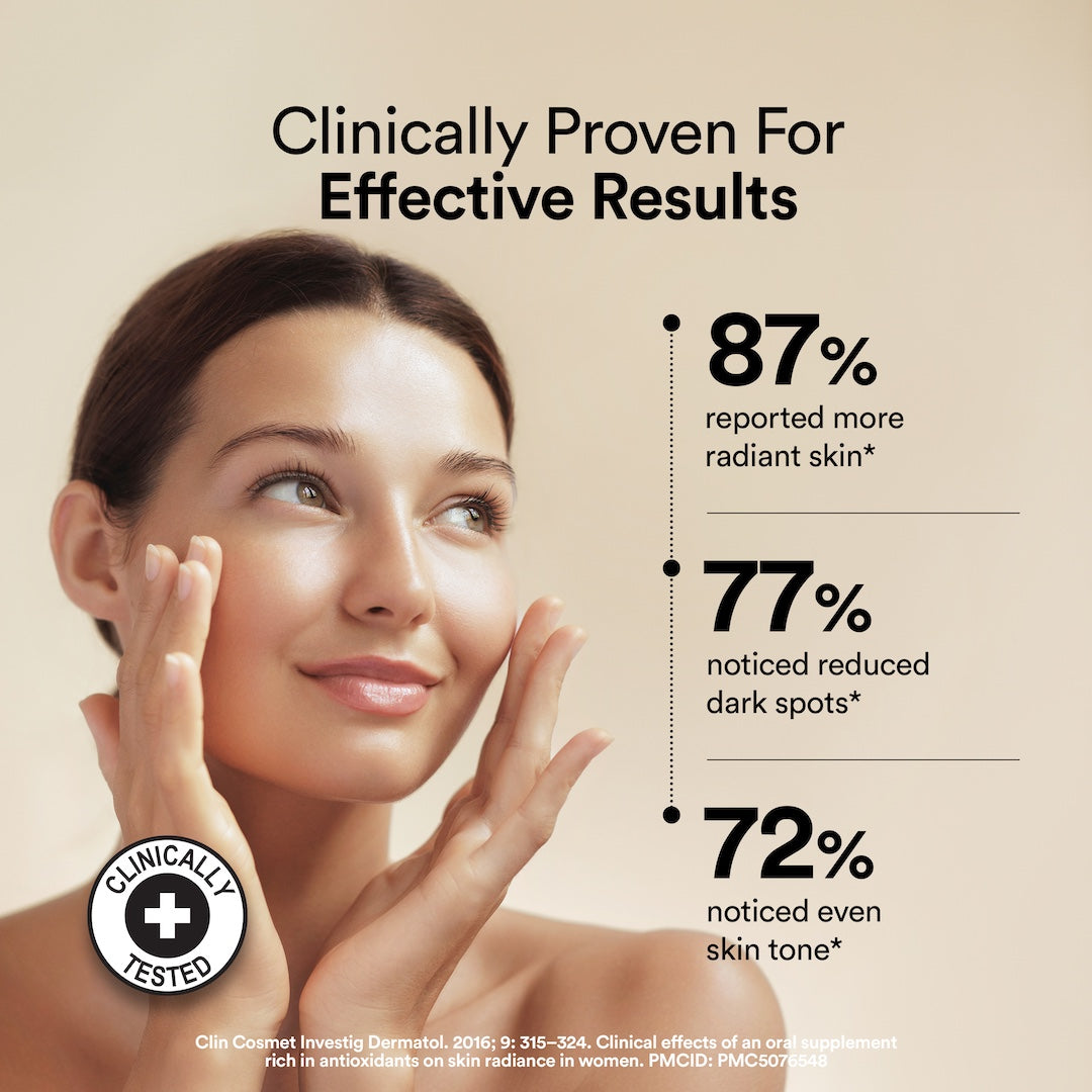 It’s a highly absorbable antioxidant protected by liposomal technology, which prevents breakdown in digestion, allowing it to work faster in reducing pigmentation, oxidative stress and uneven skin tone.