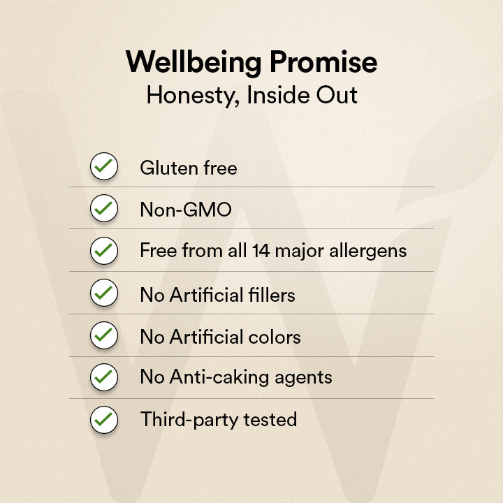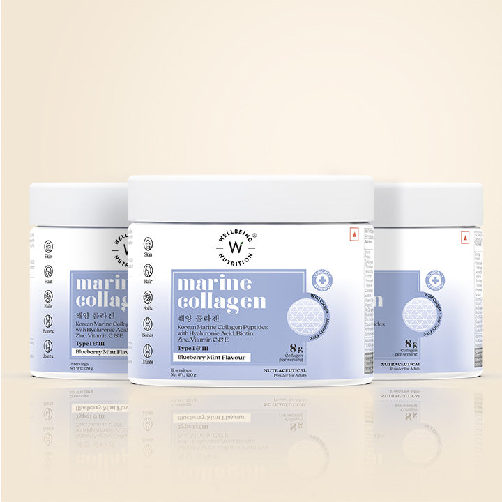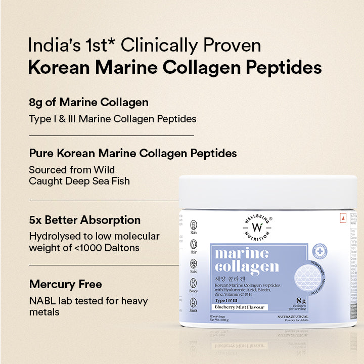 Wellbeing Nutrition's Pure Korean Marine Collagen is formulated with a powerful blend of natural ingredients to boost collagen production. It features Korean Marine Collagen Peptides sourced from wild-caught deep sea fish, Hyaluronic acid, Biotin and Zinc with vitamins C & E, clinically proven to help improve skin elasticity, texture, reduce wrinkles and improve overall skin, hair, nail and joint health.