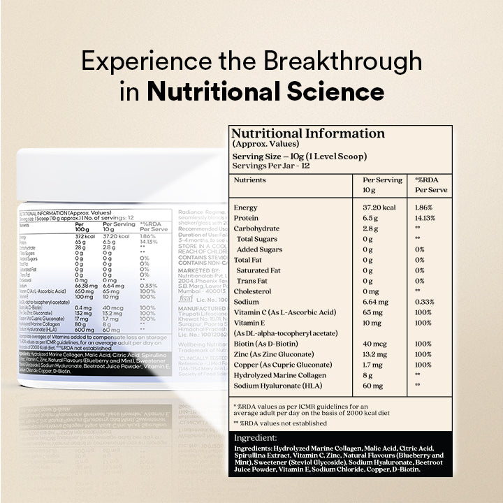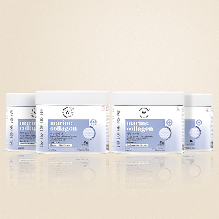 Our premium, beauty collagen easily blends into smoothies, shakes & juices. We even like it mixed into overnight-soaked oats. Mix one scoop of Wellbeing Nutrition’s Korean Marine Collagen Bluberry Mint Flavour with 250 ml water. For best results, consume one scoop daily for 12 weeks.