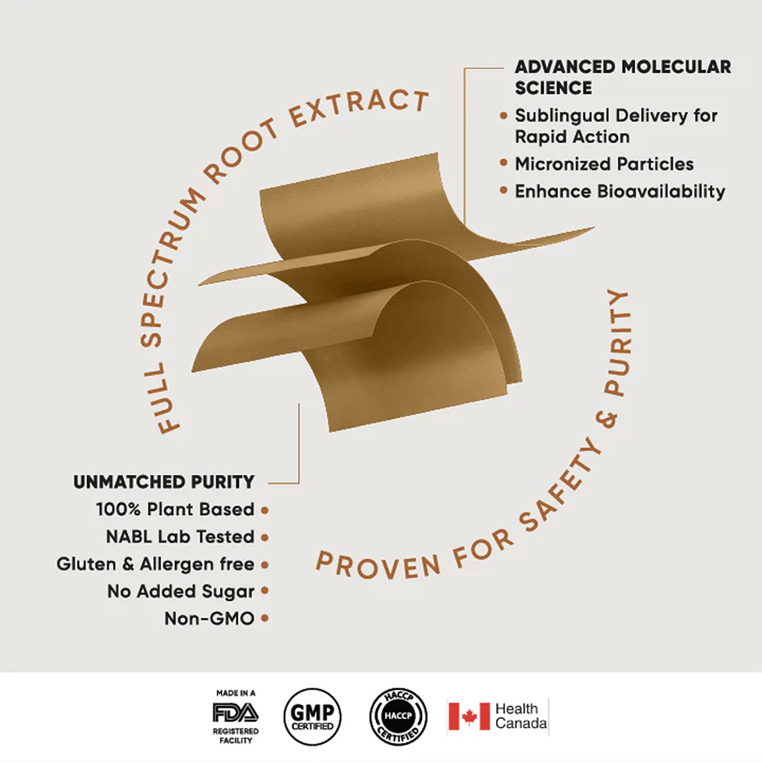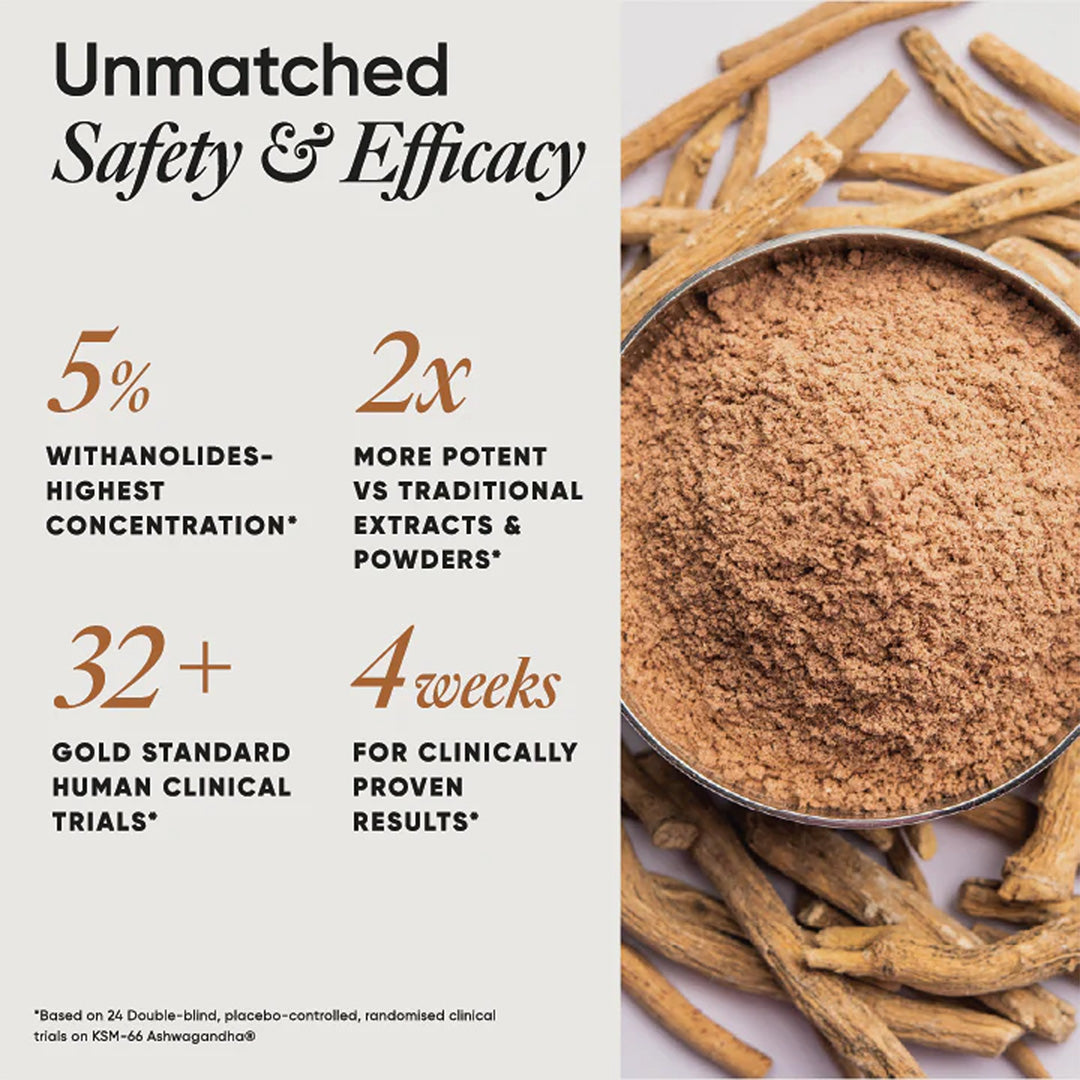 KSM-66 Ashwagandha® the most scientifically studied full spectrum root extract that supports both mental and physical performance. Backed by 14 years of research and gold-standard clinical trials, it is extracted exclusively from the roots using a holistic method that preserves its full therapeutic potential for maximum efficacy. It is 100% plant-based, NABL lab tested, Halal, Kosher, gluten- and allergen-free, BSCG Drug-Free, with no added sugar, and Non-GMO Project Verified. Recognized for its exceptional quality, it holds multiple certifications, including USDA Organic, Health Canada, GMP, FDA GRAS approval, and HACCP. It is the most certified botanical, meeting the highest safety and quality standards.