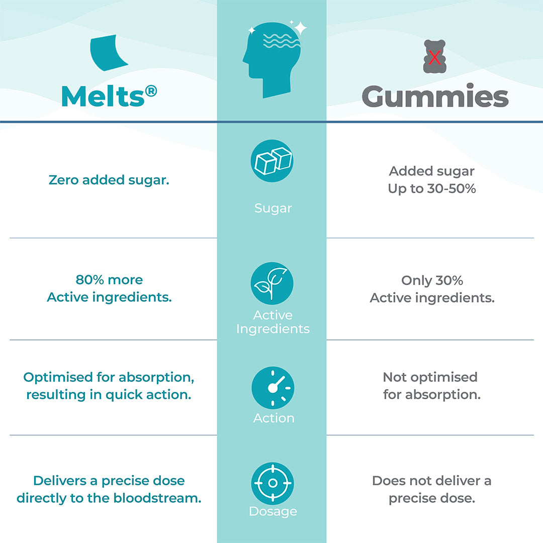 melts®️ into Calm & Relaxation is a clinically-proven, fast-acting, and plant-based supplement with 95% more bioavailability than traditional tablets/capsules/sugar-filled gummies. It is a mind-relaxing supplement that helps to soothe tension, promote feelings of calmness and experience complete peace of mind. It also reduces psychological and physiological stress responses, while keeping you alert.
