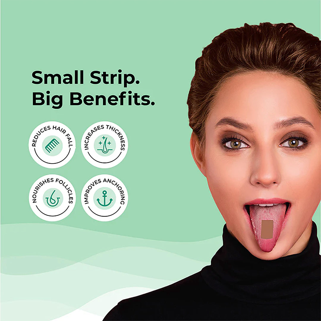The strips contain zinc supplements for hair and iron supplements for hair loss (AB-Fortis®) that are essential for follicle function, keratin synthesis, and oxygen delivery to roots. Zinc helps regulate scalp oil production and supports repair mechanisms, while iron ensures follicles remain active and nourished.