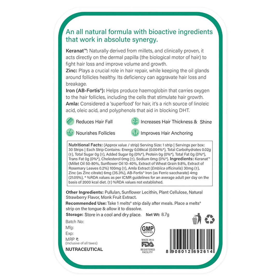 melts® Hair Fall Control oral strips are a fast-acting, 100% plant-based supplement for hair fall control.