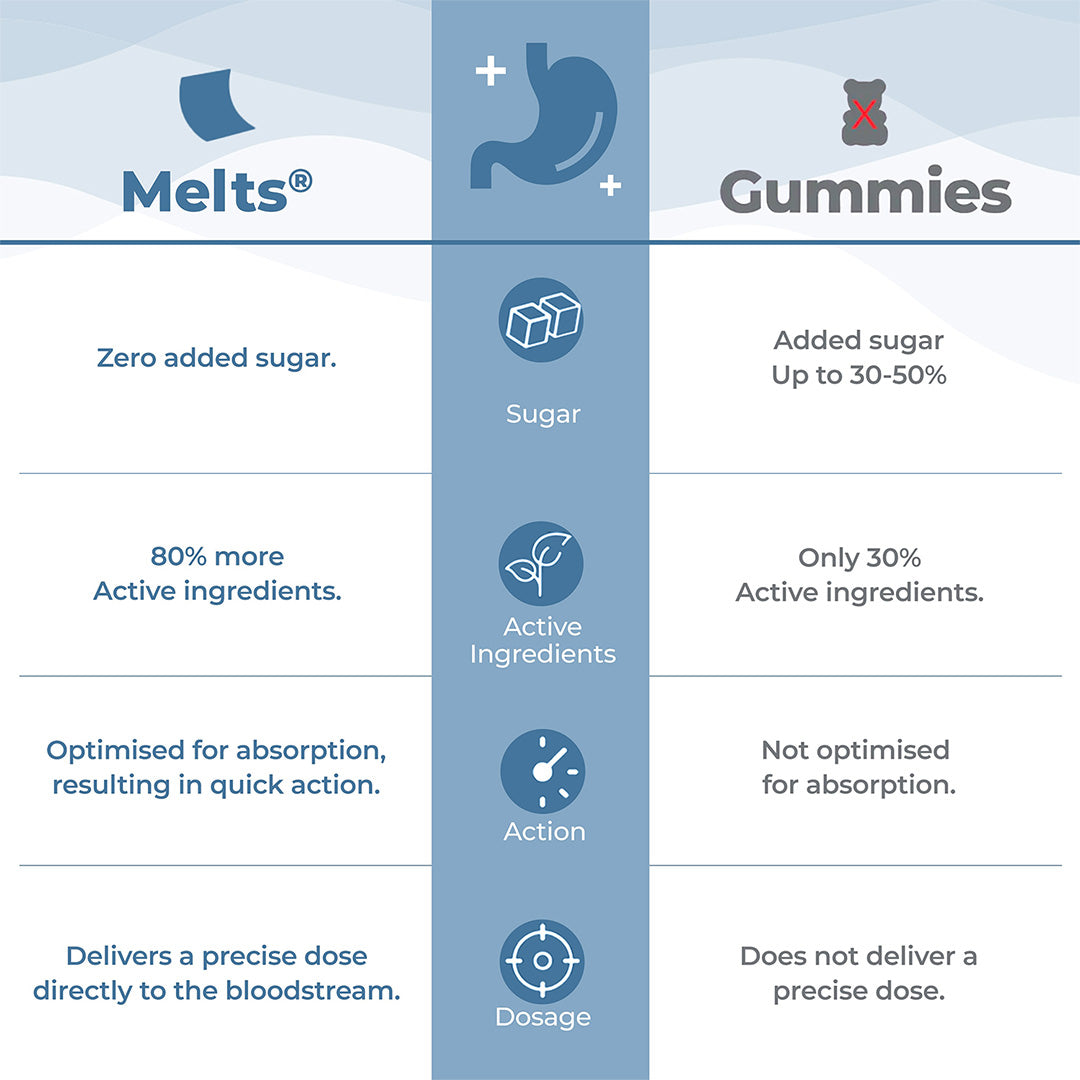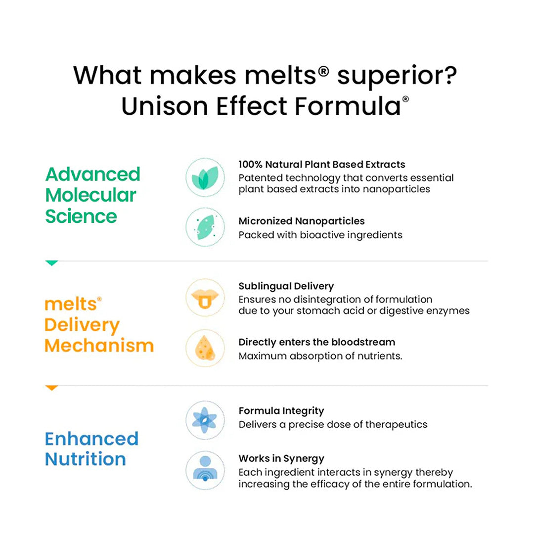 Place a melts®️ strip on your tongue and allow it to dissolve. Make sure to take your melts®️ Healthy Gut 30 minutes after your meals.