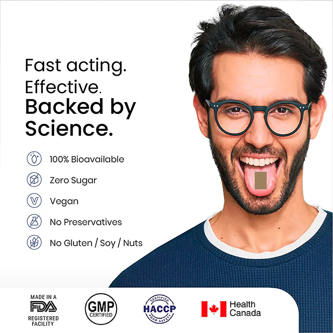 Our strips are made from 100% natural ingredients. ensuring a clean and efiective product. With micronized active ingredients for enhanced obsorption, these strips require no water and can be taken anywhere-no swalowing necessary.Enjoy 100% bioavailability for rapid nutrient delivery and instant benefits. Each strip offers a precise dose for consistent intake and optimal results.