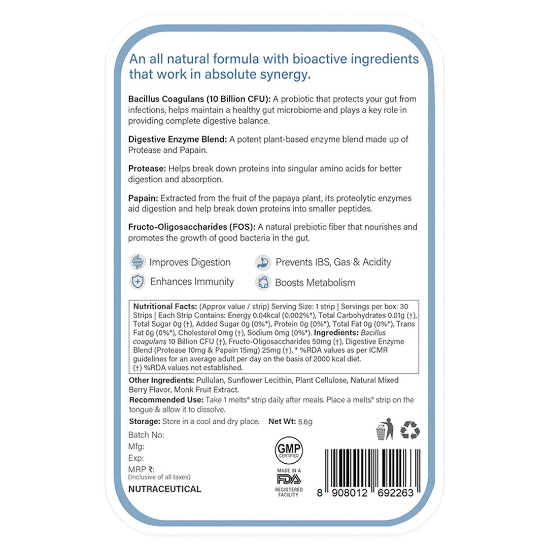 • High-Potency Probiotics  Each strip contains Bacillus coagulans, a resilient strain that helps restore gut microbiota and improve overall digestive function.