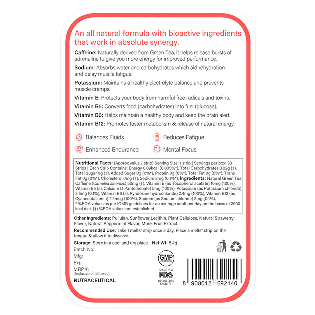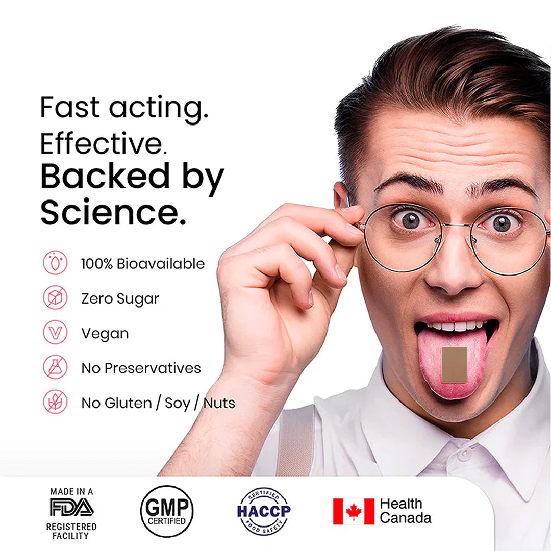 Our strips are made from 100% natural ingredients. ensuring a clean and efiective product. With micronized active ingredients for enhanced absorption, these strips require no water and can be taken anywhere-no swallowing necessary.Enjoy 100% bioavailability for rapid nutrient delivery and instant benefits. Each strip offers a precise dose for consistent intake and optimal results.