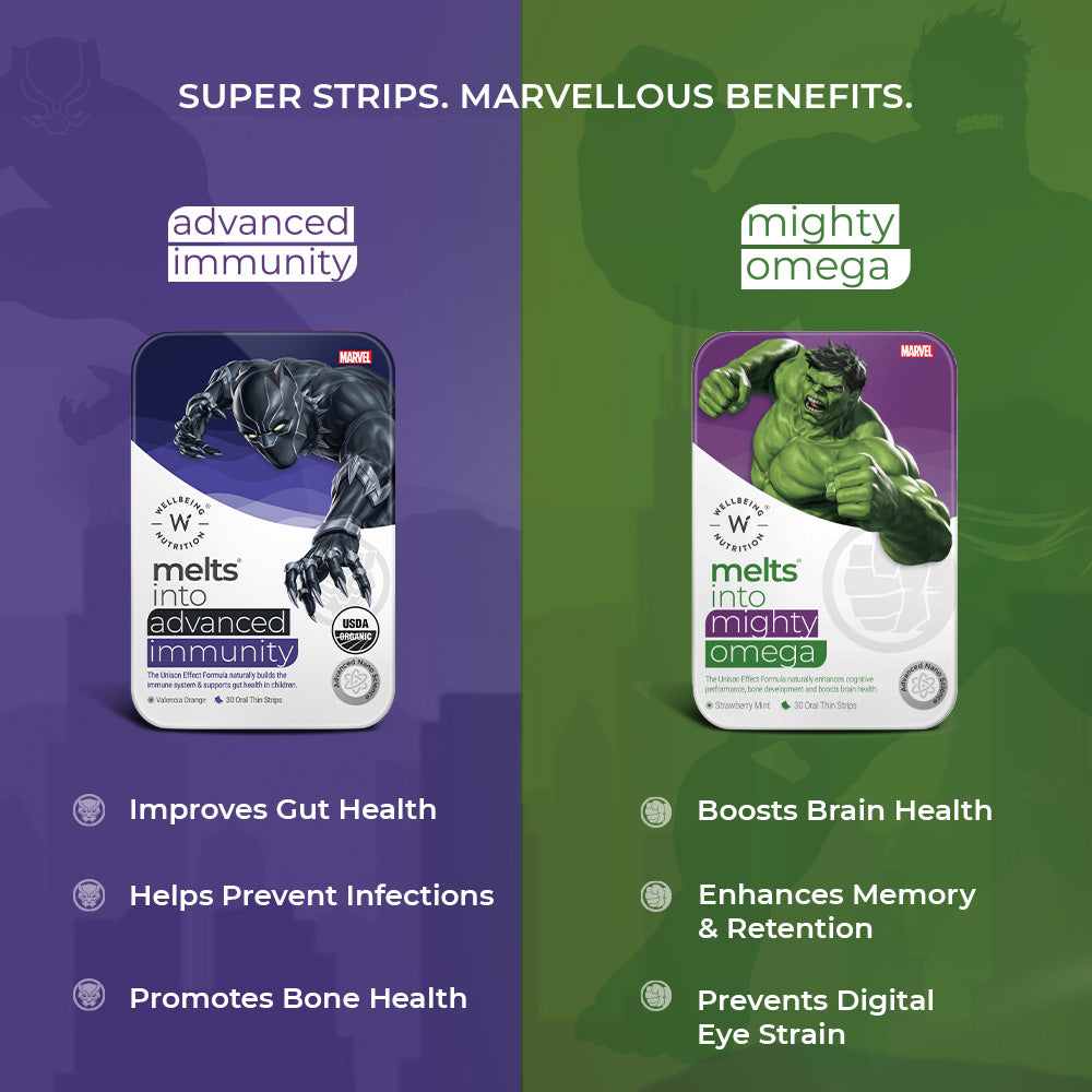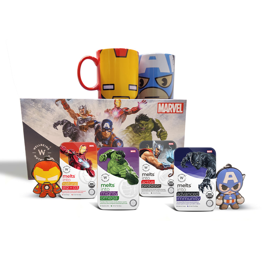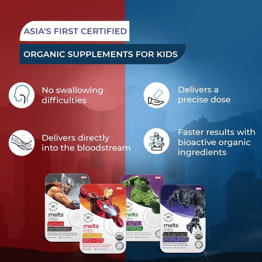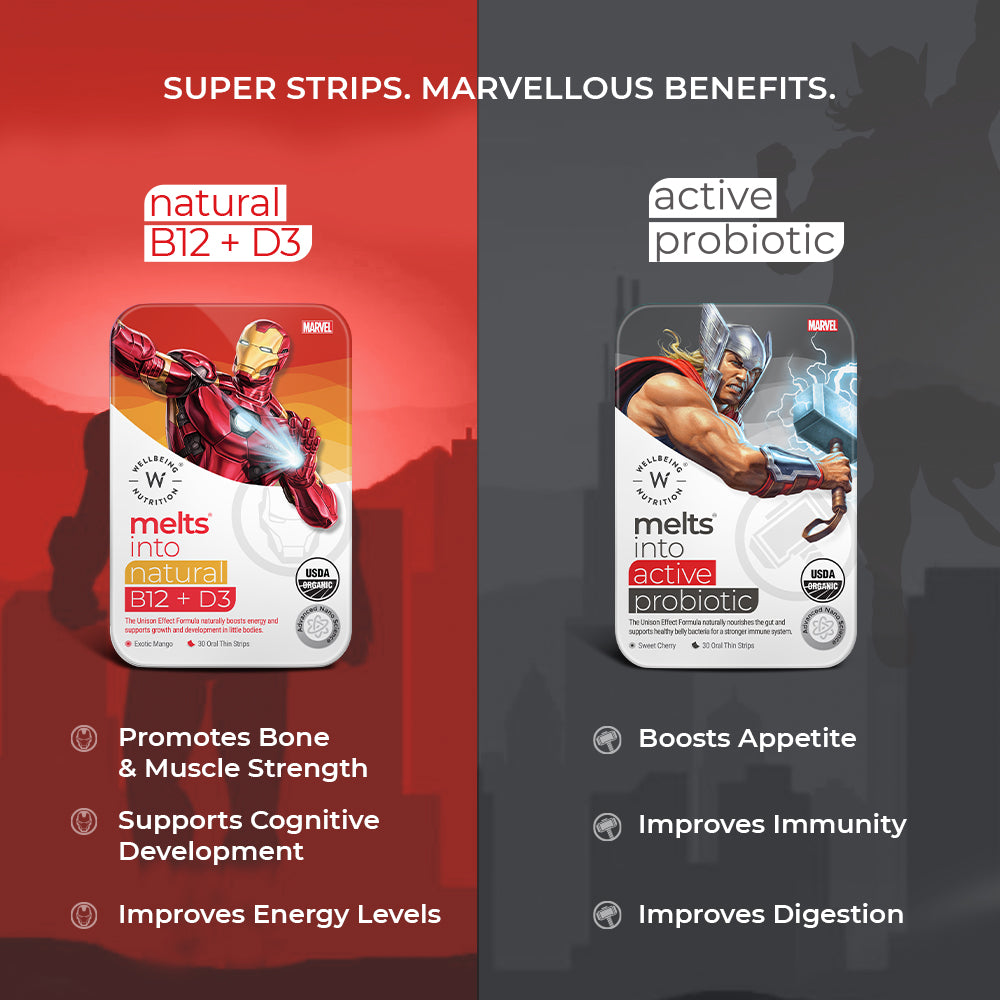 Let your little superhero suit up for a healthy battle and be invincible like Iron Man. Armoured with vital nutrients like Organic Vitamin B12, D3+K2 and Folate, this delicious melt-in-your-mouth strip will provide your genius with the daily boost he needs.