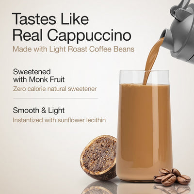 • Sweetened naturally with monk fruit & infused with Ghanaian roasted coffee for a rich Cappuccino flavour