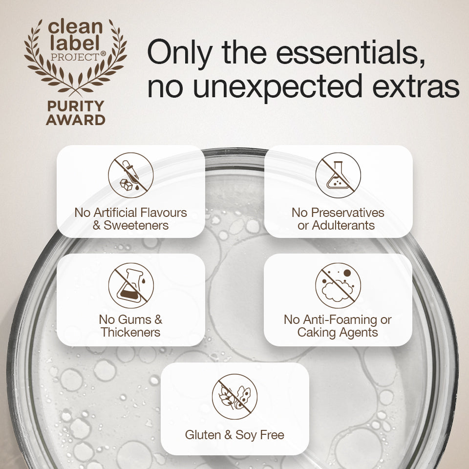 Our ultra-pure, fast-absorbing, non-denatured microfiltered whey isolate is sourced directly from milk and is not a by-product of cheese. Processed at low temperatures without the use of acids or bleach, resulting in a purer, more intact protein. Infused with the world’s finest Vanilla beans, naturally sweetened with monk fruit, and instantized with sunflower lecithin, our formula features clinically proven Velositol® - a complex of two forms of amylopectin & chromium that doubles protein synthesis in 8 weeks. Natural digestive enzymes Bromelain from Pineapple & Papain from Papaya help break down protein for easier digestion and 4B CFU of probiotics, Lactobacillus acidophilus and Bifidobacterium longum improve gut microflora.