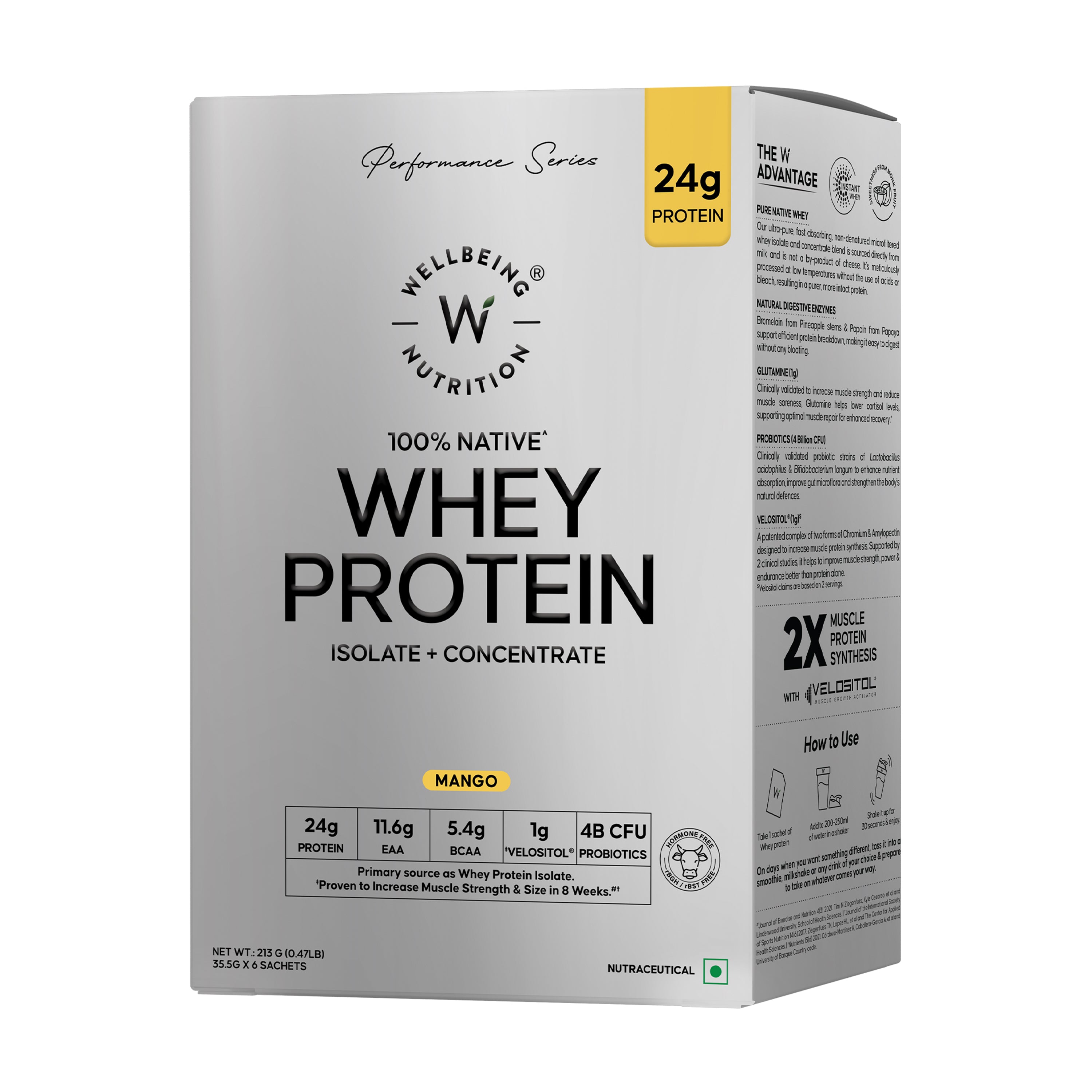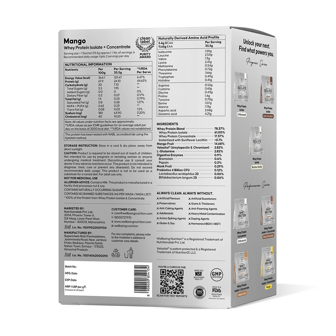 Introducing India’s first Whey Protein Isolate & Concentrate Powder with Velositol® – clinically proven to enhance muscle strength and endurance in just 8 weeks. Crafted for performance and purity, this ultra-fast absorbing whey delivers 24g of high-quality protein, 11.6g of EAAs, 5.4g of BCAAs, and 1g of Glutamine. Powered by 4 Billion CFU probiotics and digestive enzymes, it supports gut health and eliminates bloating, so your nutrition works as hard as you do. Flavoured with real mangoes harvested from Brazil and sweetened naturally with zero-calorie monk fruit, our mango-flavoured whey protein is instantized for a smooth, light texture, ideal for powering up your workouts, aiding recovery, or simply elevating your daily nutrition.
