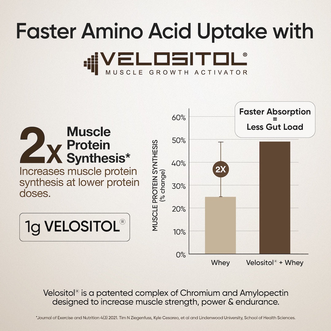 Each serving includes 1 g of clinically studied Velositol®, a patented complex of amylopectin and chromium designed to enhance muscle protein synthesis.
